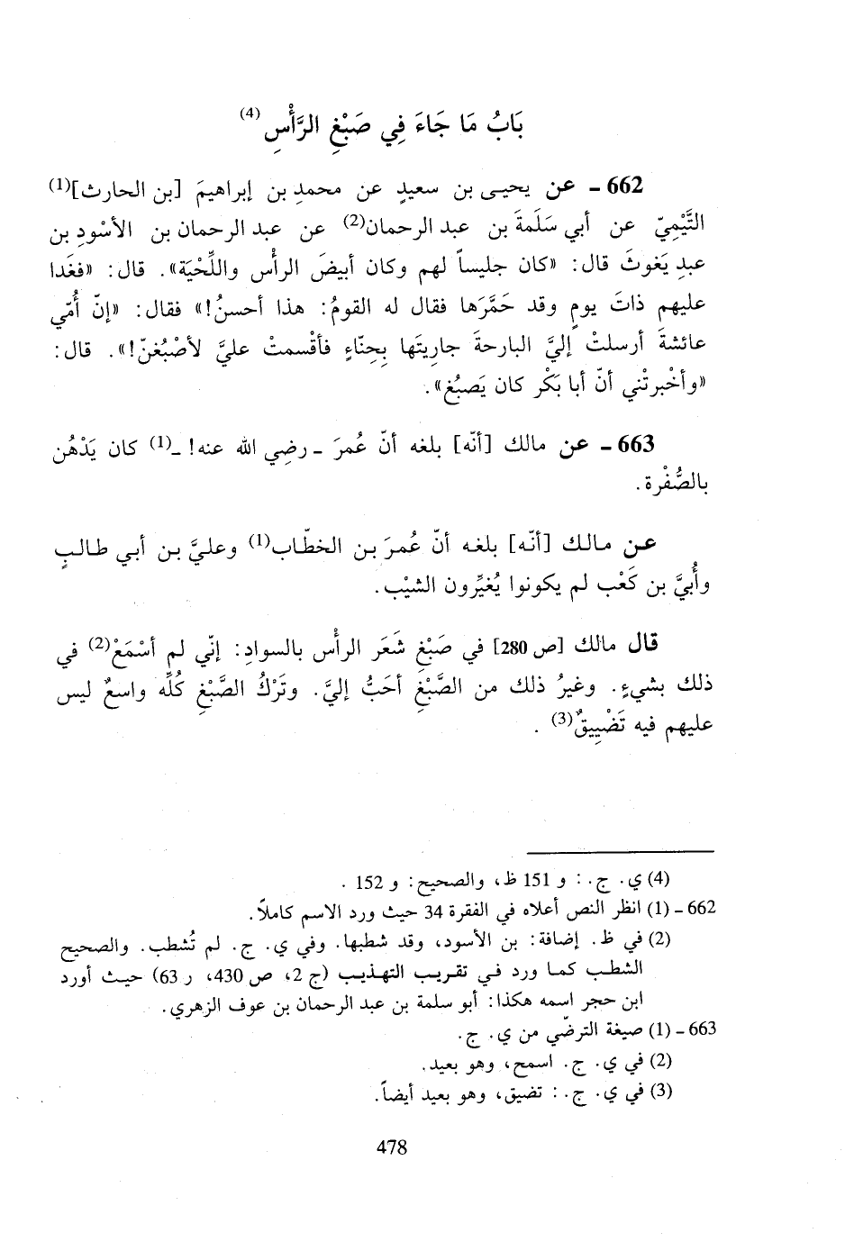 662- عن يحيى بن سعيد عن محمد بن إبراهيم [بن الحارث] التيمي عن أبي سلمة بن عبد الرحمان عن عبد الرحمان بن الأسود بن عبد يغوث قال: ((كان جليساً لهم وكان أبيض الرأس واللحية)). قال: ((فغدا عليهم ذات يومٍ وقد حمرها فقال له القوم: هذا أحسنّ)) فقال: ((إن أمي عائشة أرسلت إلي البارحة جاريتها بحناءٍ فأقسمت علي لأصبغن!)). قال: ((وأخبرتني أن أبا بكر كان يصبغ)).