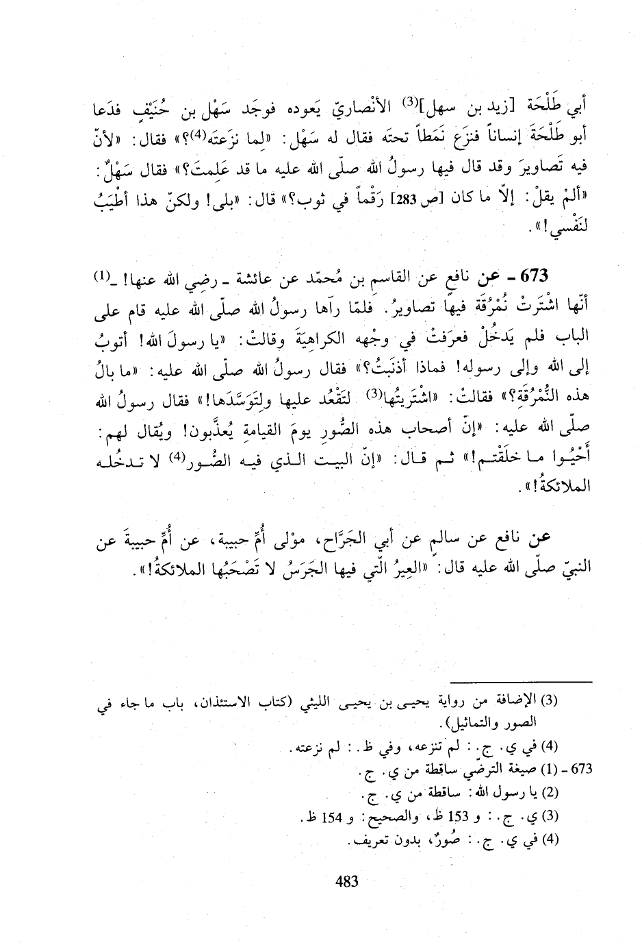 673- عن نافعٍ عن القاسم بن محمد عن عائشة -رضي الله عنها!- أنها اشترت نمرقة فيها تصاوير. فلما رآها رسول الله صلى الله عليه قام على الباب فلم يدخل فعرفت في وجهه الكراهية وقالت: ((يا رسول الله! أتوب إلى الله وإلى رسوله! فماذا أذنبت؟)) فقال رسول الله صلى الله عليه: ((ما بال هذه النمرقة؟)) فقالت: ((اشتريتها لتقعد عليها ولتوسدها!)) فقال رسول الله صلى الله عليه: ((إن أصحاب هذه الصور يوم القيامة يعذبون! ويقال لهم: أحيوا ما خلقتم!)) ثم قال: ((إن البيت الذي فيه الصور لا تدخله الملائكة!)).