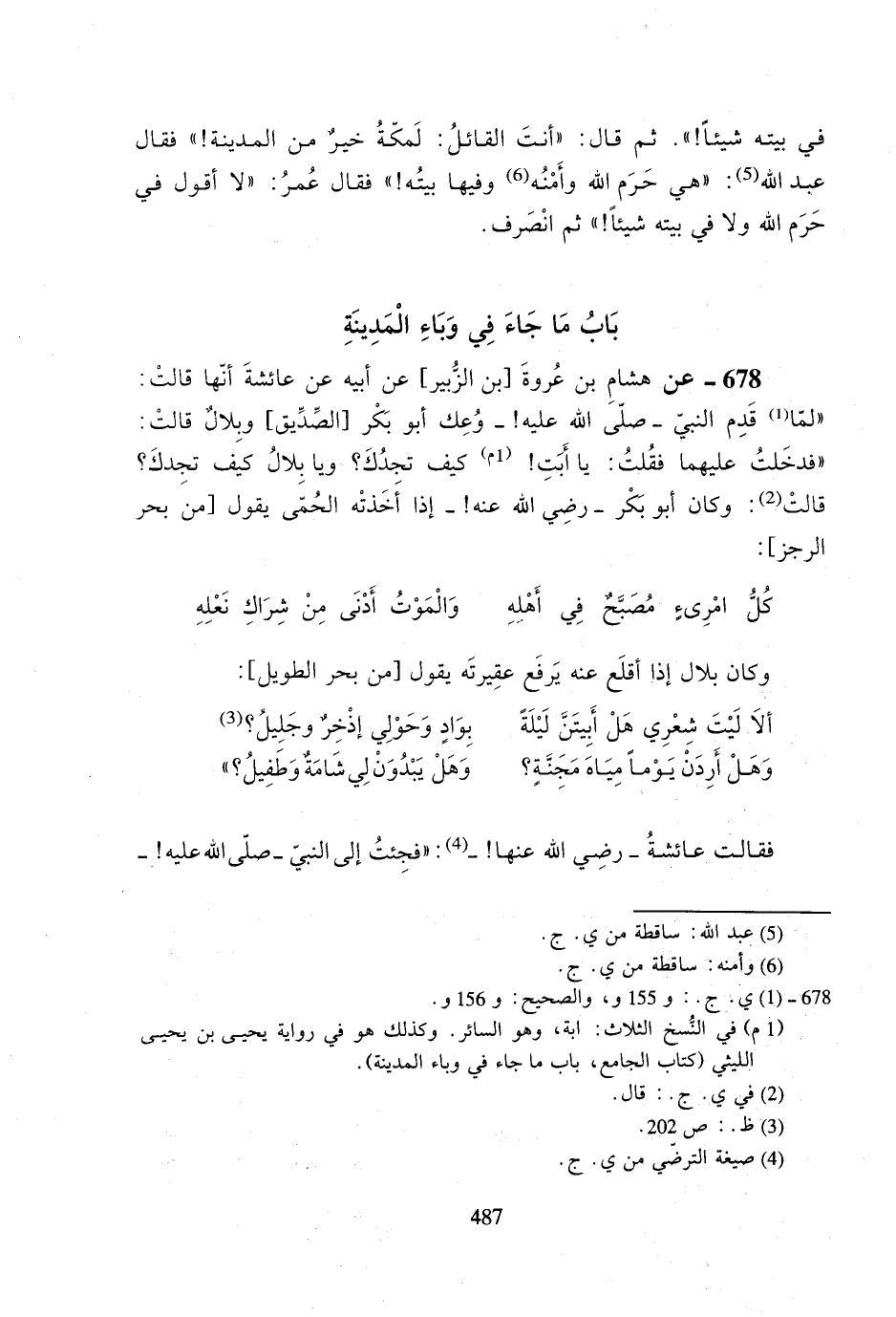 فقالت عائشة رضي الله عنها!-: ((فجئت إلى النبي -صلى الله عليه!- #488# وأخبرته فقال: اللهم حبب إلينا المدينة كحبنا مكة وأشد حباً وصححها وبارك لنا في صاعها ومدها وانقل حماها واجعلها بالجحفة!)).