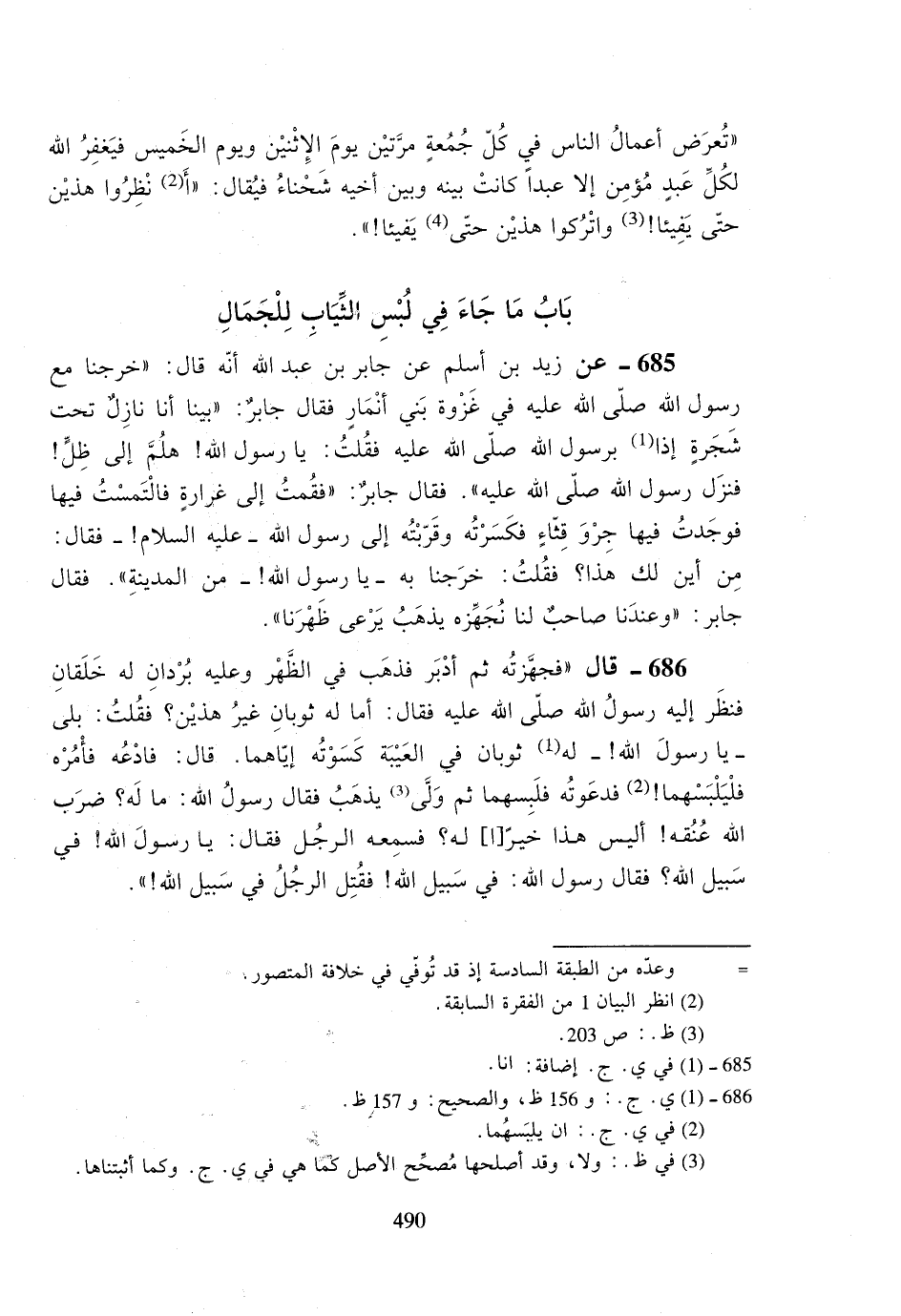 686- قال: ((فجهزته ثم أدبر فذهب في الظهر وعليه بردان له خلقان فنظر إليه رسول الله صلى الله عليه فقال: أما له ثوبان غير هذين؟ فقلت: بلى يا رسول الله!- له ثوبان في العيبة كسوته إياهما. قال: فادعه فأمره فليلبسهما! فدعوته فلبسهما ثم ولى يذهب فقال رسول الله: ما له؟ ضرب الله عنقه! أليس هذا خيرً[ا] له؟ فسمعه الرجل فقال: يا رسول الله! في سبيل الله؟ فقال رسول الله: في سبيل الله! فقتل الرجل في سبيل الله!)).