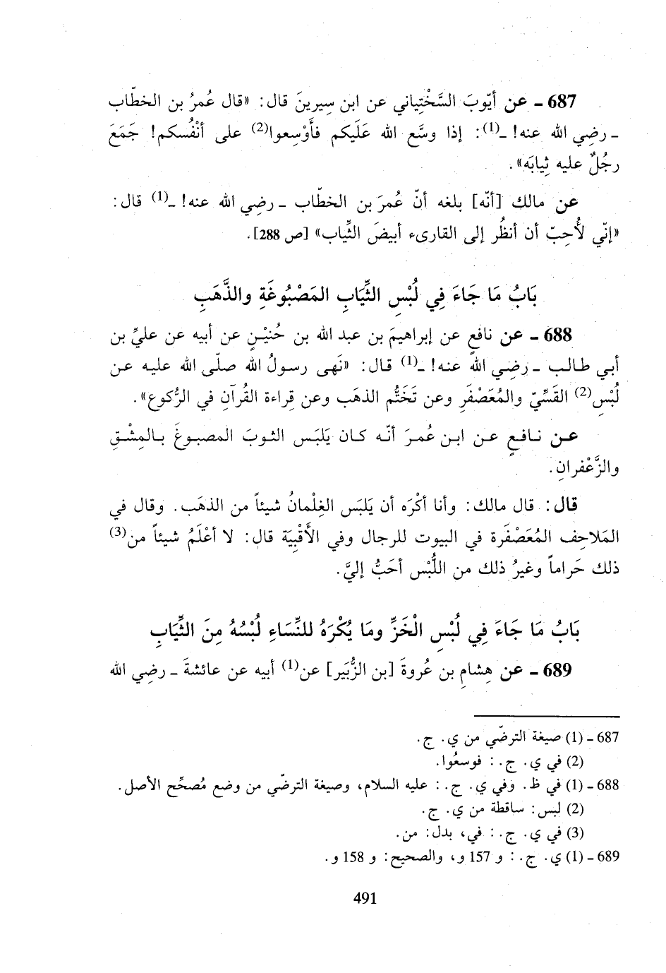 688- عن نافع عن إبراهيم بن عبد الله بن حنينٍ عن أبيه عن علي بن أبي طالب -رضي الله عنه!- قال: ((نهى رسول الله صلى الله عليه عن لبس القسي والمعصفر وعن تختم الذهب وعن قراءة القرآن في الركوع)).