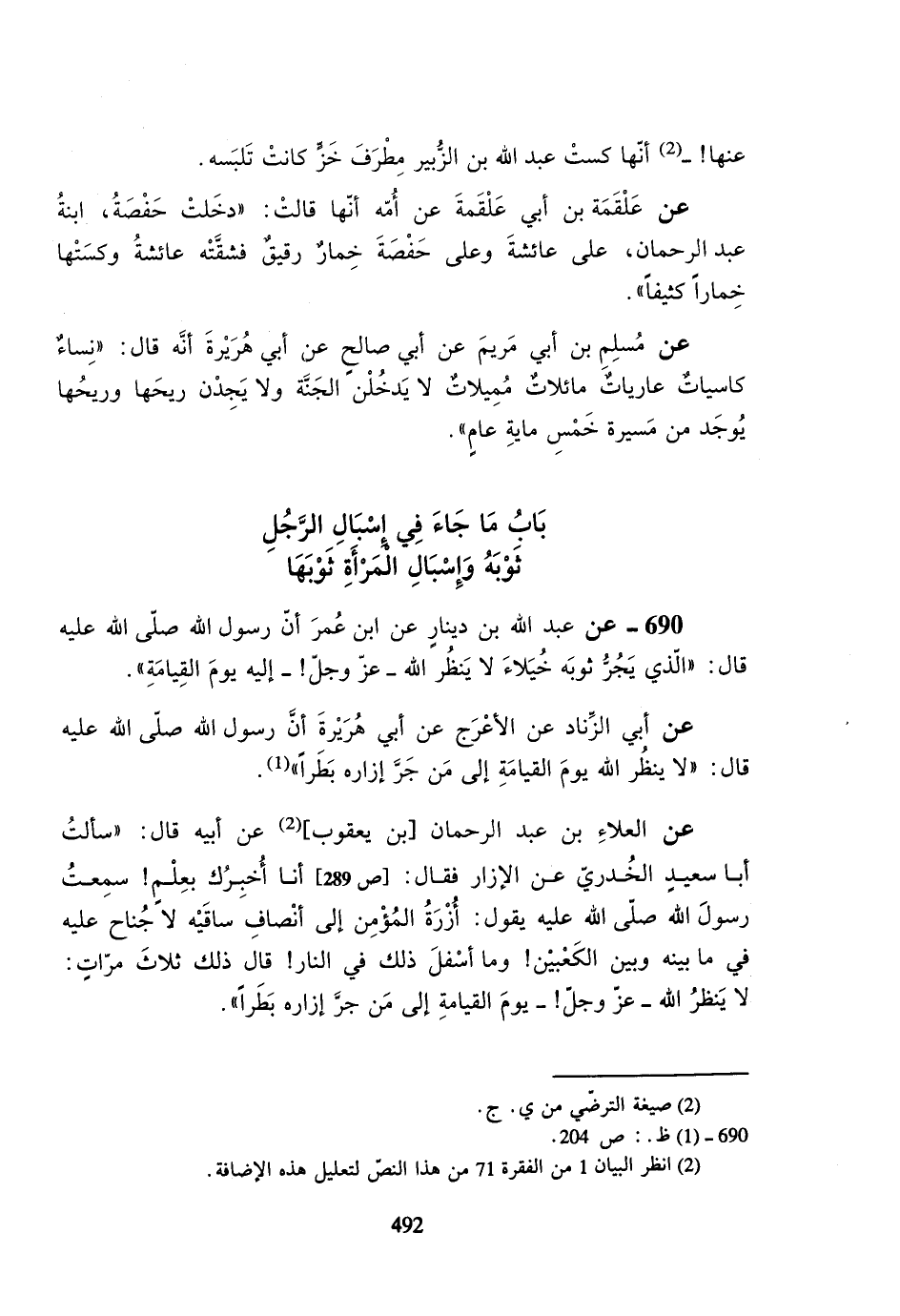 690- عن عبد الله بن دينارٍ عن ابن عمر أن رسول الله صلى الله عليه قال: ((الذي يجر ثوبه خيلاء لا ينظر الله -عز وجل!- إليه يوم القيامة)).