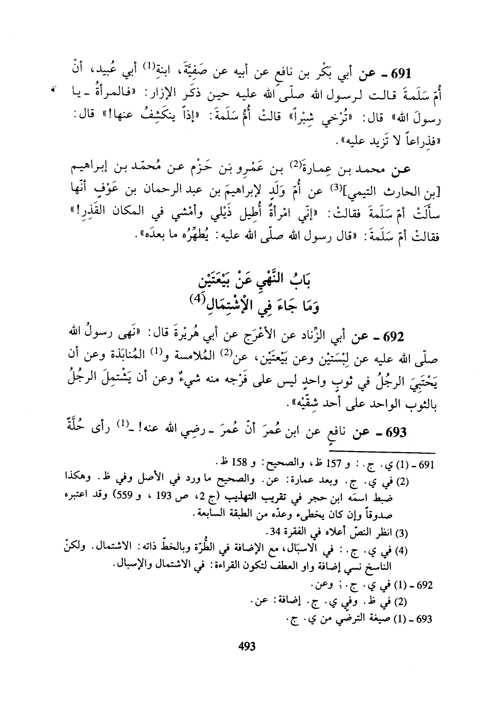 691- عن أبي بكر بن نافعٍ عن أبيه عن صفية، ابنة أبي عبيد، أن أم سلمة قالت لرسول الله صلى الله عليه حين ذكر الإزار: ((فالمرأة - يا رسول الله)) قال: ((ترخي شبراً)) قالت أم سلمة: ((إذاً ينكشف عنها!)) قال: ((فذراعاً لا تزيد عليه)).
