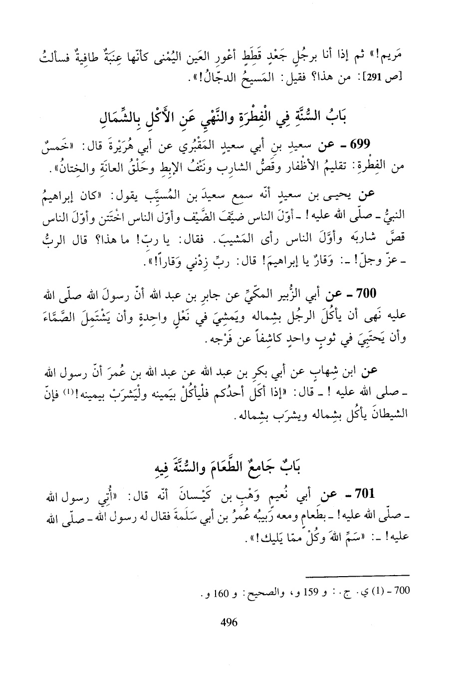 700- عن أبي الزبير المكي عن جابر بن عبد الله أن رسول الله صلى الله عليه نهى أن يأكل الرجل بشماله ويمشي في نعلٍ واحدةٍ وأن يشتمل الصماء وأن يحتبي في ثوبٍ واحدٍ كاشفاً عن فرجه.