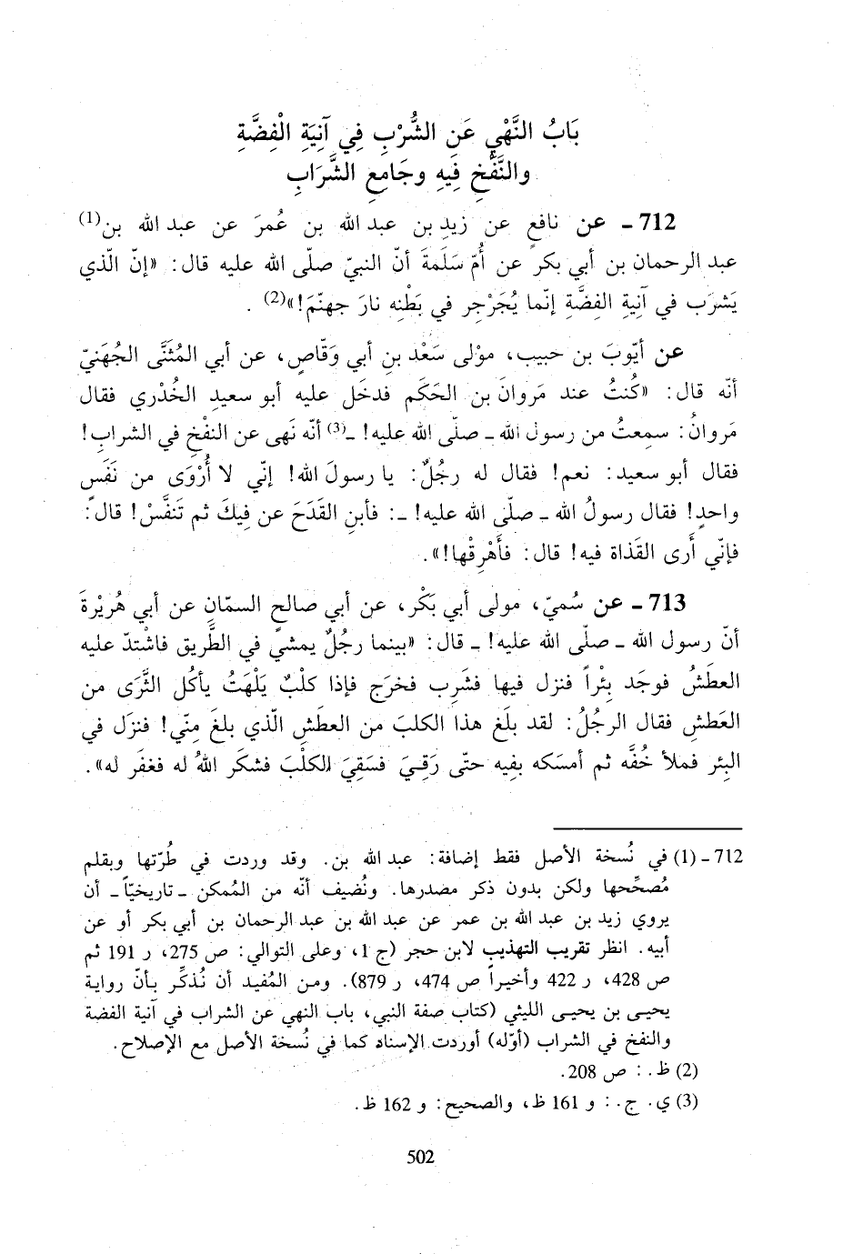 712- عن نافع عن زيد بن عبد الله بن عمر عن عبد الله بن عبد الرحمان بن أبي بكر عن أم سلمة أن النبي صلى الله عليه قال: ((إن الذي يشرب في آنية الفضة إنما يجرجر في بطنه نار جهنم!)).
