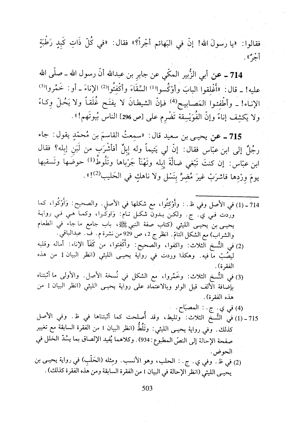 715- عن يحيى بن سعيد قال: ((سمعت القاسم بن محمدٍ يقول: جاء رجلٌ إلى ابن عباس فقال: إن لي يتيماً وله إبلٌ أفأشرب من لبن إبله؟ فقال ابن عباس: إن كنت تبغي ضالة إبله وتهنأ جرباها وتلوط حوضها وتسبها يوم وردها فاشرب غير مضر بنسل ولا ناهكٍ في الحليب!)).