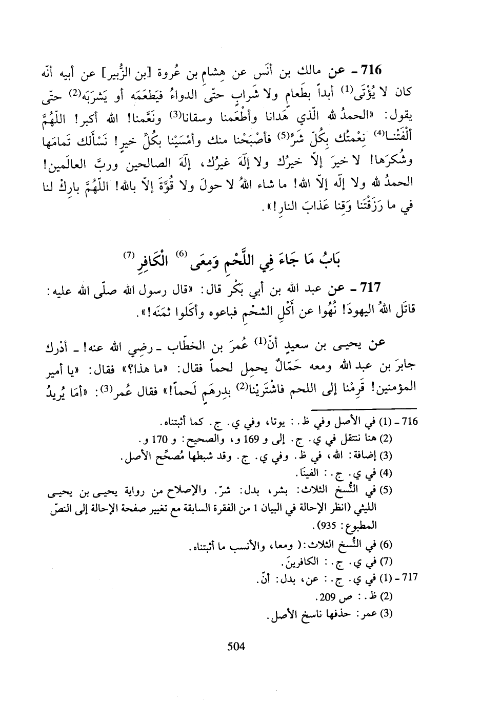 716- عن مالك بن أنس عن هشام بن عروة [بن الزبير] عن أبيه أنه كان لا يؤتى أبداً بطعامٍ ولا شرابٍ حتى الدواء فيطعمه أو يشربه حتى يقول: ((الحمد لله الذي هدانا وأطعمنا وسقانا ونعمنا! الله أكبر! اللهم ألفتنا نعمتك بكل شر فأصبحنا منك وأمسينا بكل خيرٍ! نسألك تمامها وشكرها! لا خير إلا خيرك ولا إله غيرك، إله الصالحين ورب العالمين! الحمد لله ولا إله إلا الله! ما شاء الله لا حول ولا قوة إلا بالله! اللهم بارك لنا في ما رزقتنا وقنا عذاب النار!)).