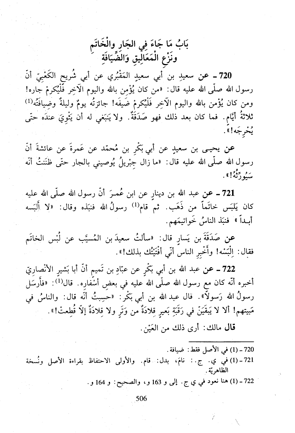 720- عن سعيد بن أبي سعيد المقبري عن أبي شريح الكعبي أن رسول الله صلى الله عليه قال: ((من كان يؤمن بالله واليوم الآخر فليكرم جاره! ومن كان يؤمن بالله واليوم الآخر فليكرم ضيفه! جائزته يومٌ وليلةٌ وضيافته ثلاثة أيامٍ. فما كان بعد ذلك فهو صدقةٌ. ولا ينبغي له أن يثوي عنده حتى يحرجه!)).