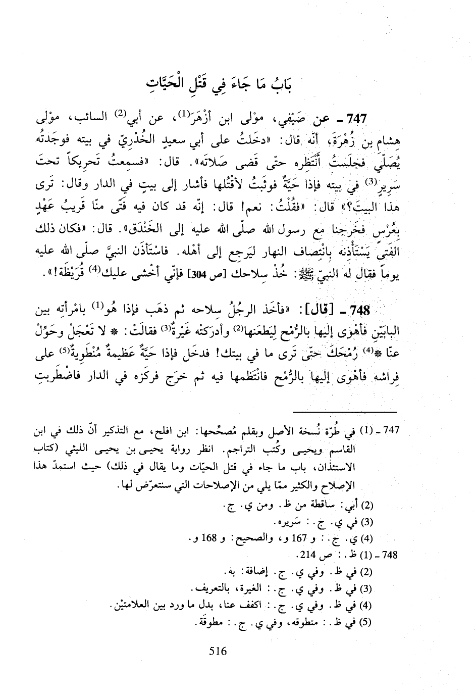747- عن صيفي، مولى ابن أزهر، عن أبي السائب، مولى هشام بن زهرة، أنه قال: ((دخلت على أبي سعيدٍ الخدري في بيته فوجدته يصلي فجلست أنتظره حتى قضى صلاته)). قال: ((فسمعت تحريكاً تحت سريرٍ في بيته فإذا حيةٌ فوثبت لأقتلها فأشار إلى بيتٍ في الدار وقال: ترى هذا البيت؟)) قال: ((فقلت: نعمّ قال: إنه قد كان فيه فتًى منا قريب عهدٍ بعرسٍ فخرجنا مع رسول الله صلى الله عليه إلى الخندق)). قال: ((فكان ذلك الفتى يستأذنه بانتصاف النهار ليرجع إلى أهله. فاستأذن النبي صلى الله عليه يوماً فقال له النبي صلى الله عليه وسلم: ((خذ سلاحك فإني أخشى عليك قريظة!)).