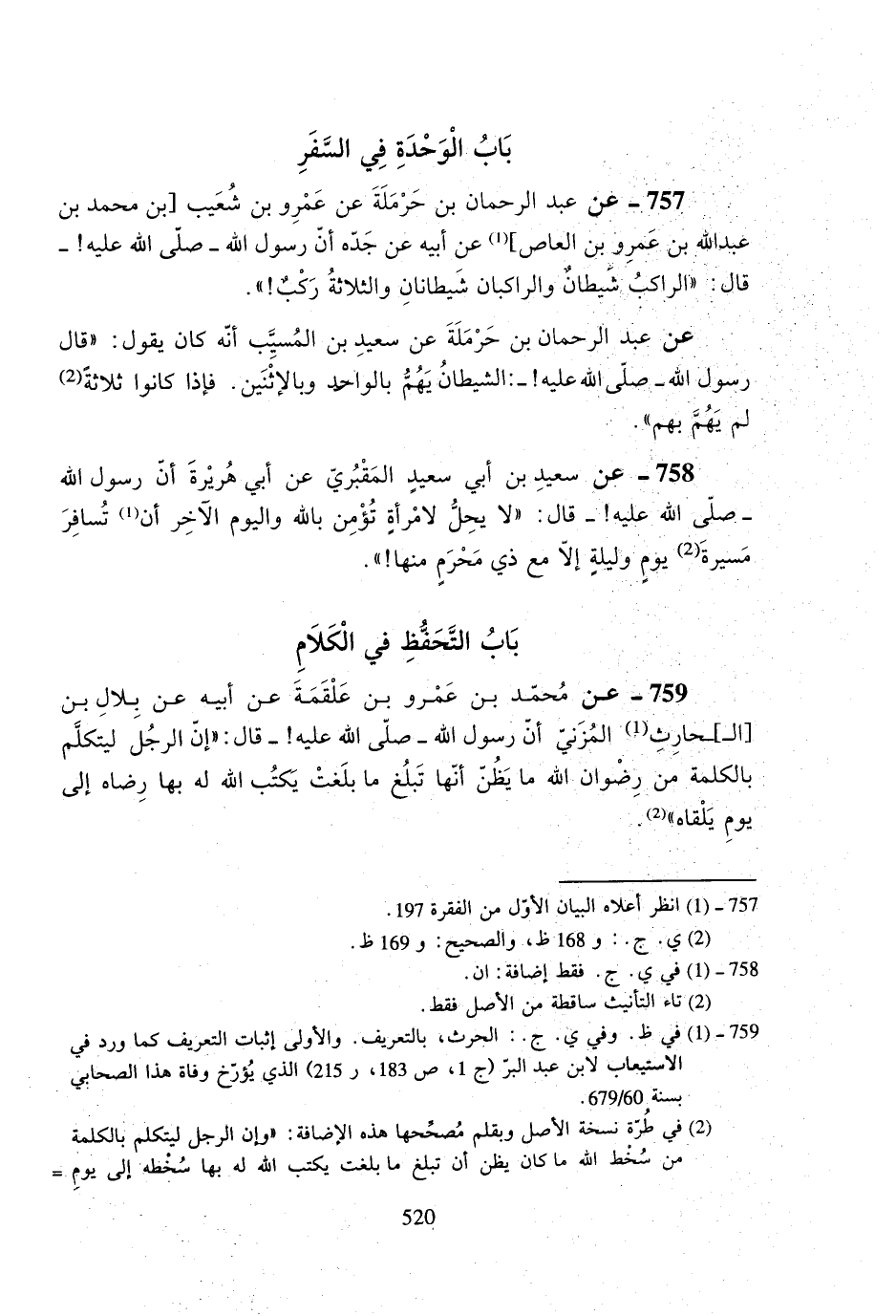 757- عن عبد الرحمان بن حرملة عن عمرو بن شعيب [بن محمد بن عبد الله بن عمرو بن العاص] عن أبيه عن جده أن رسول الله -صلى الله عليه!- قال: ((الراكب شيطانٌ والراكبان شيطانان والثلاثة ركبٌ!)).