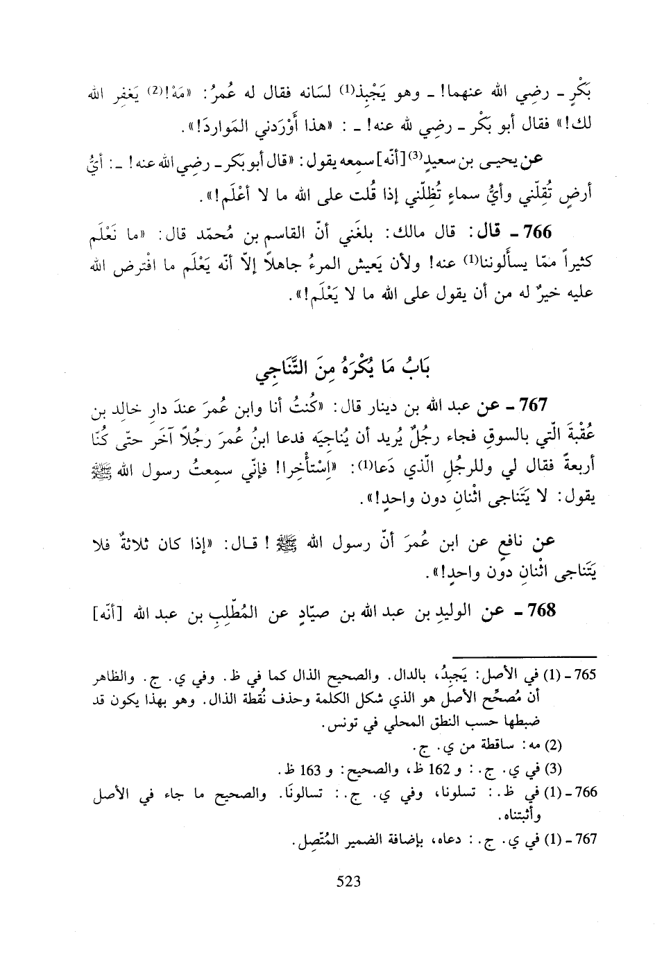 767- عن عبد الله بن دينار قال: ((كنت أنا وابن عمر عند دار خالد بن عقبة التي بالسوق فجاء رجلٌ يريد أن يناجيه فدعا ابن عمر رجلاً آخر حتى كنا أربعةً فقال لي وللرجل الذي دعا: ((استأخرا! فإني سمعت رسول الله صلى الله عليه وسلم يقول: لا يتناجى اثنان دون واحدٍ!)).