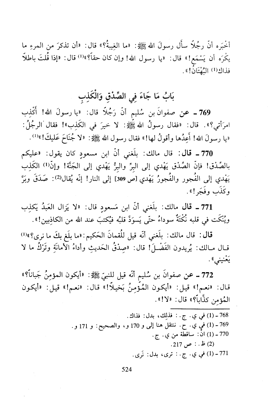 771- قال مالك: بلغني أن ابن مسعودٍ قال: ((لا يزال العبد يكذب وينكت في قلبه نكتةٌ سوداء حتى يسود قلبه فيكتب عند الله من الكاذبين!)).