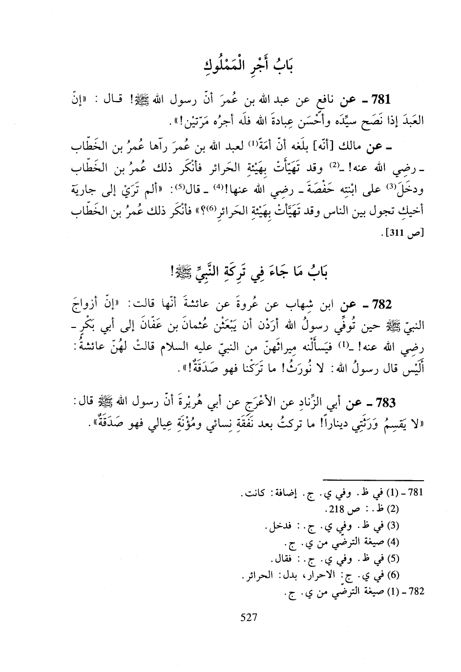 782- عن ابن شهاب عن عروة عن عائشة أنها قالت: ((إن أزواج النبي صلى الله عليه وسلم حين توفي رسول الله أردن أن يبعثن عثمان بن عفان إلى أبي بكر -رضي الله عنه!- فيسألنه ميراثهن من النبي عليه السلام قالت لهن عائشة: أليس قال رسول الله: لا نورث! ما تركنا فهو صدقةٌ!)).
