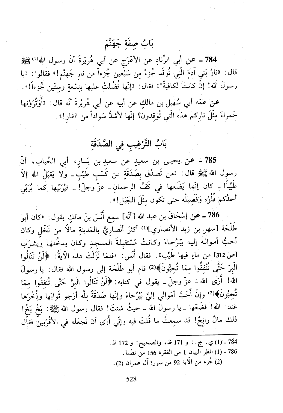 784- عن أبي الزناد عن الأعرج عن أبي هريرة أن رسول الله صلى الله عليه وسلم قال: ((نار بني آدم التي توقد جزءٌ من سبعين جزءاً من نار جهنم!)) فقالوا: ((يا رسول الله! إن كانت لكافيةً!)) فقال: ((إنها فضلت عليها بتسعةٍ وستين جزءاً)).