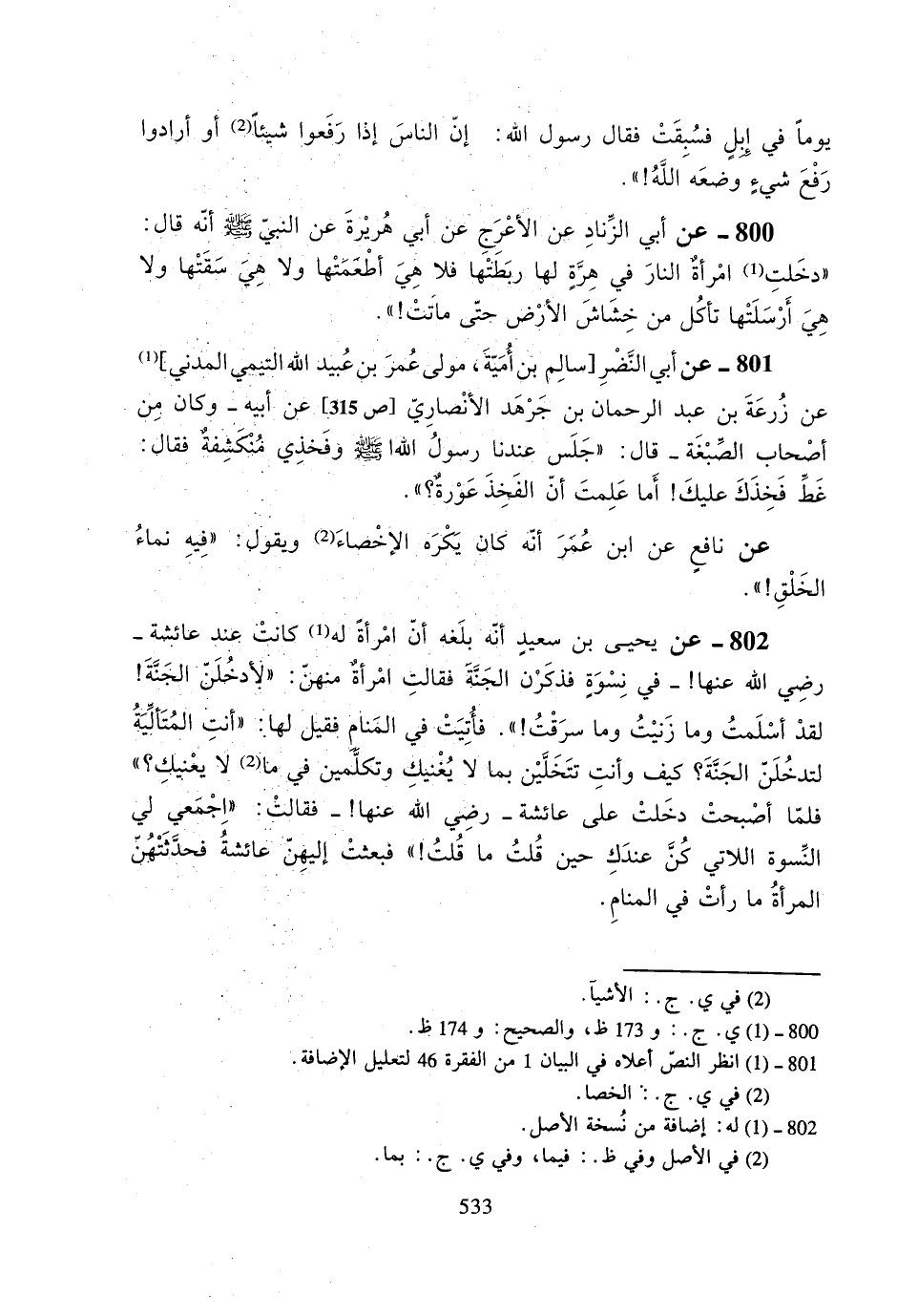 800- عن أبي الزناد عن الأعرج عن أبي هريرة عن النبي صلى الله عليه وسلم أنه قال: ((دخلت امرأةٌ النار في هرةٍ لها ربطتها فلا هي أطعمتها ولا هي سقتها ولا هي أرسلتها تأكل من خشاش الأرض حتى ماتت!)).