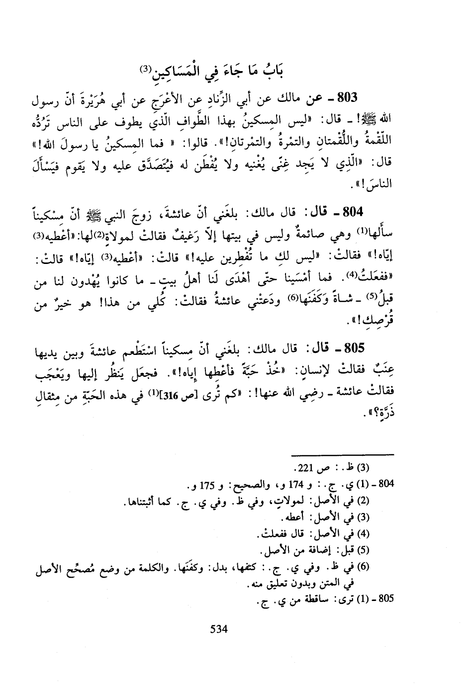 803- عن مالك عن أبي الزناد عن الأعرج عن أبي هريرة أن رسول الله صلى الله عليه وسلم! قال: ((ليس المسكين بهذا الطواف الذي يطوف على الناس ترده اللقمة واللقمتان والتمرة والتمرتان!)). قالوا: ((فما المسكين يا رسول الله!)) قال: ((الذي لا يجد غنًى يغنيه ولا يفطن له فيتصدق عليه ولا يقوم فيسأل الناس!)).