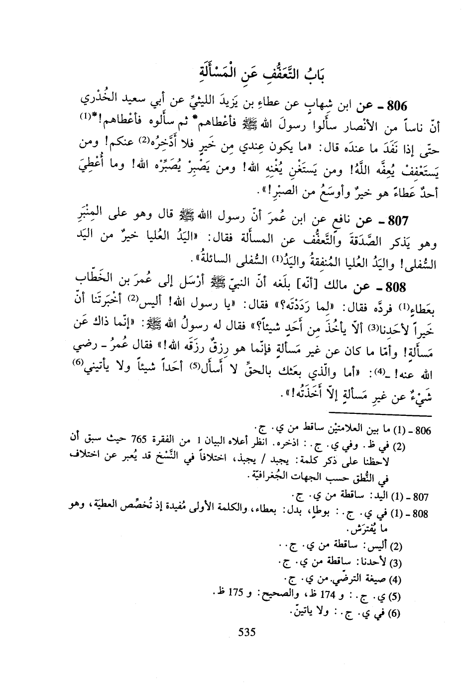806- عن ابن شهابٍ عن عطاء بن يزيد الليثي عن أبي سعيد الخدري أن ناساً من الأنصار سألوا رسول الله صلى الله عليه وسلم فأعطاهم ثم سألوه فأعطاهم! حتى إذا نفذ ما عنده قال: ((ما يكون عندي من خيرٍ فلا أدخره عنكم! ومن يستعفف يعفه الله! ومن يستغن يغنه الله! ومن يصبر يصبره الله! وما أعطي أحدٌ عطاءً هو خيرٌ وأوسع من الصبر!)).