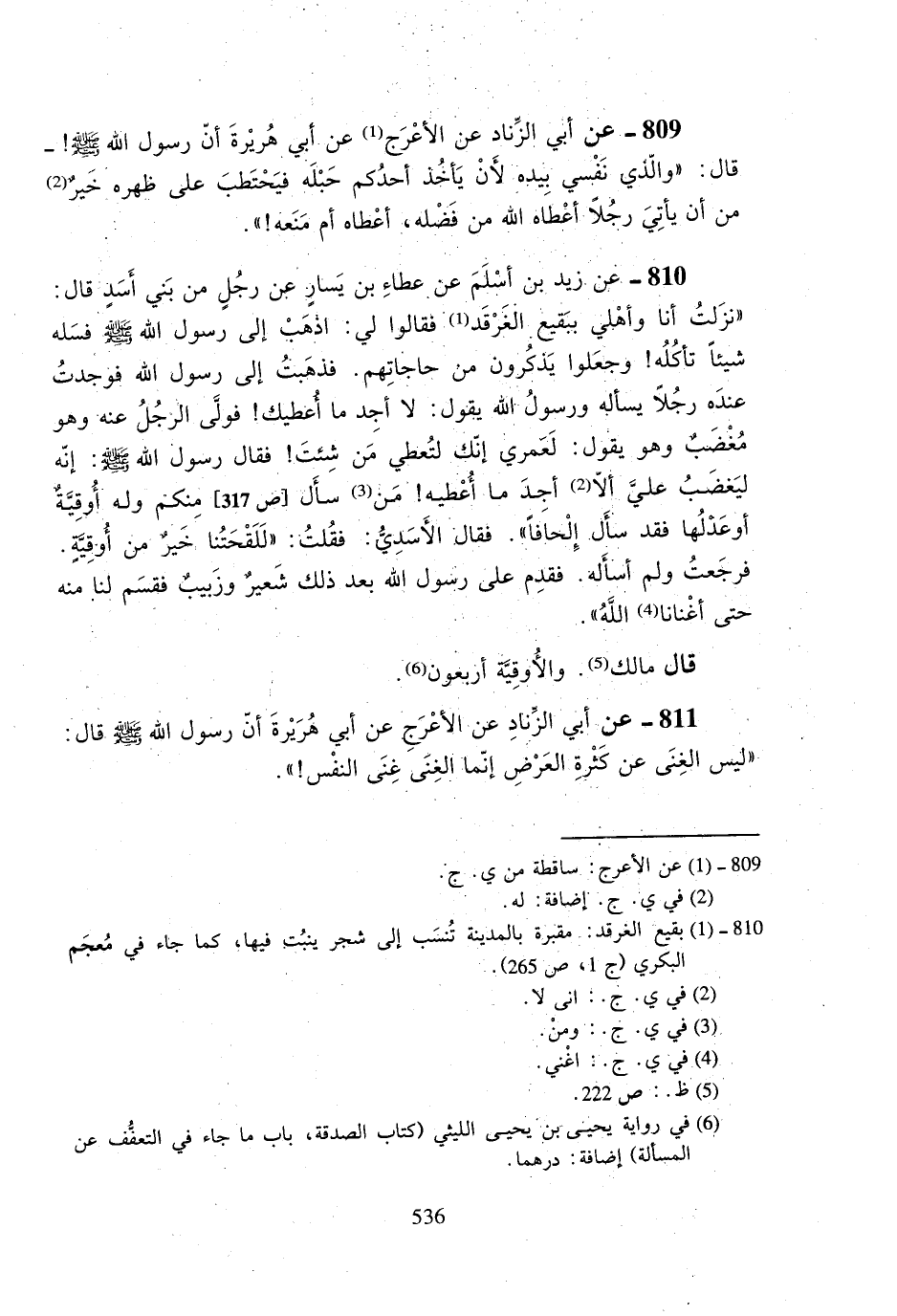 809- عن أبي الزناد عن الأعرج عن أبي هريرة أن رسول الله صلى الله عليه وسلم! - قال: ((والذي نفسي بيده لأن يأخذ أحدكم حبله فيحتطب على ظهره خيرٌ من أن يأتي رجلاً أعطاه الله من فضله، أعطاه أو منعه!)).