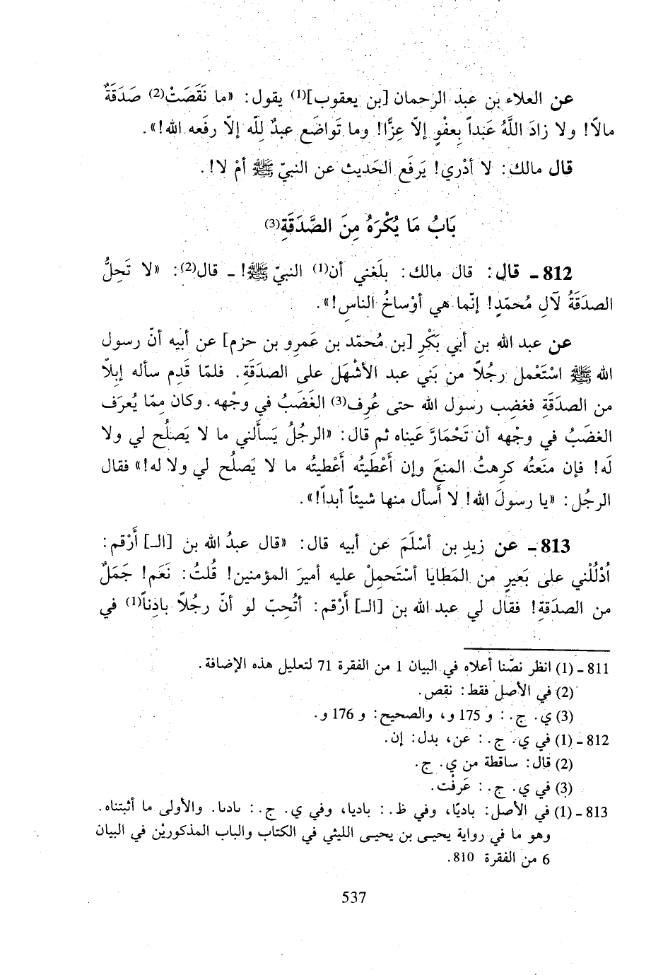 812- قال: قال مالك: بلغني أن النبي صلى الله عليه وسلم! - قال: ((لا تحل الصدقة لآل محمدٍ! إنما هي أوساخ الناس!)).