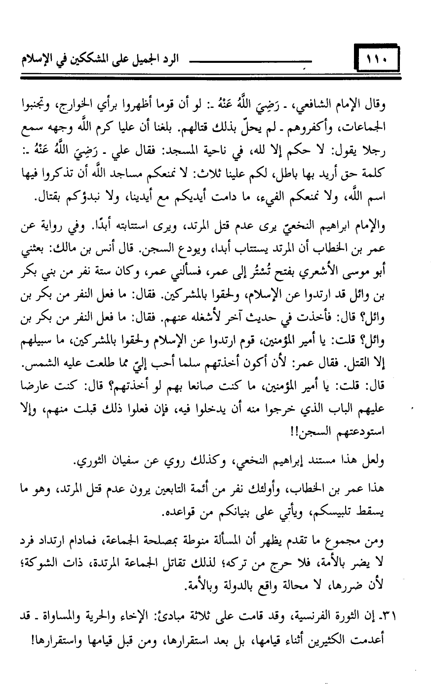 هذا عمر بن الخطاب، وأولئك نفر من أئمة التابعين يرون عدم قتل المرتد، وهو ما يسقط تلبيسكم، ويأتي على بنيانكم من قواعده.