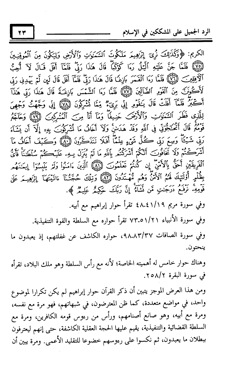 الكريم: (وَكَذَلِكَ نُرِي إِبْرَاهِيمَ مَلَكُوتَ السَّمَاوَاتِ وَالْأَرْضِ وَلِيَكُونَ مِنَ الْمُوقِنِينَ (75) فَلَمَّا جَنَّ عَلَيْهِ اللَّيْلُ رَأَى كَوْكَبًا قَالَ هَذَا رَبِّي فَلَمَّا أَفَلَ قَالَ لَا أُحِبُّ الْآفِلِينَ (76) فَلَمَّا رَأَى الْقَمَرَ بَازِغًا قَالَ هَذَا رَبِّي فَلَمَّا أَفَلَ قَالَ لَئِنْ لَمْ يَهْدِنِي رَبِّي لَأَكُونَنَّ مِنَ الْقَوْمِ الضَّالِّينَ (77) فَلَمَّا رَأَى الشَّمْسَ بَازِغَةً قَالَ هَذَا رَبِّي هَذَا أَكْبَرُ فَلَمَّا أَفَلَتْ قَالَ يَا قَوْمِ إِنِّي بَرِيءٌ مِمَّا تُشْرِكُونَ (78) إِنِّي وَجَّهْتُ وَجْهِيَ لِلَّذِي فَطَرَ السَّمَاوَاتِ وَالْأَرْضَ حَنِيفًا وَمَا أَنَا مِنَ الْمُشْرِكِينَ (79) وَحَاجَّهُ قَوْمُهُ قَالَ أَتُحَاجُّونِّي فِي اللَّهِ وَقَدْ هَدَانِ وَلَا أَخَافُ مَا تُشْرِكُونَ بِهِ إِلَّا أَنْ يَشَاءَ رَبِّي شَيْئًا وَسِعَ رَبِّي كُلَّ شَيْءٍ عِلْمًا أَفَلَا تَتَذَكَّرُونَ (80) وَكَيْفَ أَخَافُ مَا أَشْرَكْتُمْ وَلَا تَخَافُونَ أَنَّكُمْ أَشْرَكْتُمْ بِاللَّهِ مَا لَمْ يُنَزِّلْ بِهِ عَلَيْكُمْ سُلْطَانًا فَأَيُّ الْفَرِيقَيْنِ أَحَقُّ بِالْأَمْنِ إِنْ كُنْتُمْ تَعْلَمُونَ (81) الَّذِينَ آمَنُوا وَلَمْ يَلْبِسُوا إِيمَانَهُمْ بِظُلْمٍ أُولَئِكَ لَهُمُ الْأَمْنُ وَهُمْ مُهْتَدُونَ (82) وَتِلْكَ حُجَّتُنَا آتَيْنَاهَا إِبْرَاهِيمَ عَلَى قَوْمِهِ نَرْفَعُ دَرَجَاتٍ مَنْ نَشَاءُ إِنَّ رَبَّكَ حَكِيمٌ عَلِيمٌ (83) .