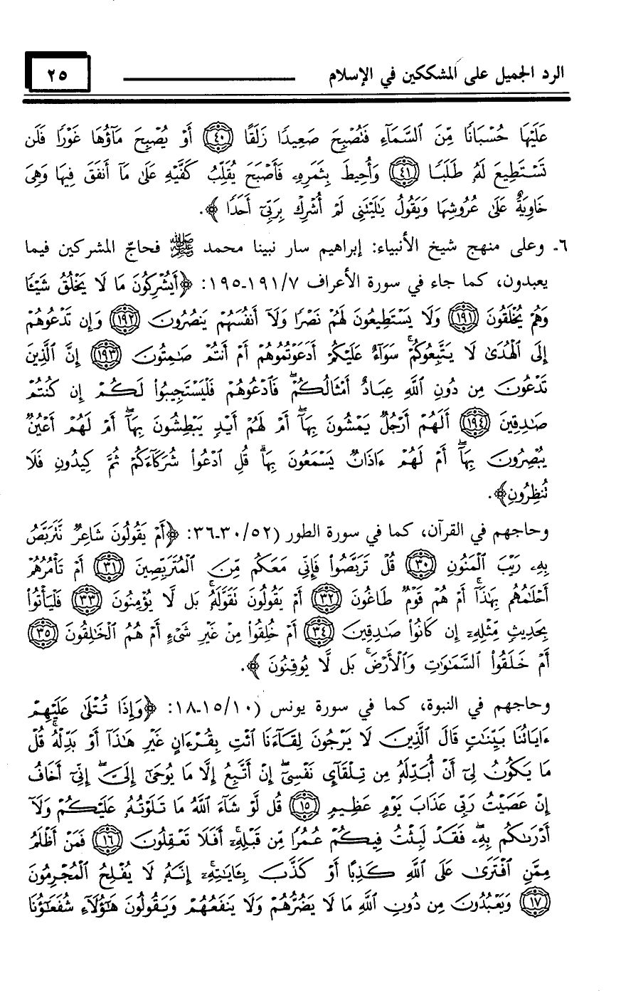 6 - وعلى منهج شيخ الأنبياء. إبراهيم سار نبينا محمد - صلى الله عليه وسلم - فحاجّ المشركين فيما يعبدون، كما جاء في سورة الأعراف 191 - 195: (أَيُشْرِكُونَ مَا لَا يَخْلُقُ شَيْئًا وَهُمْ يُخْلَقُونَ (191) وَلَا يَسْتَطِيعُونَ لَهُمْ نَصْرًا وَلَا أَنْفُسَهُمْ يَنْصُرُونَ (192) وَإِنْ تَدْعُوهُمْ إِلَى الْهُدَى لَا يَتَّبِعُوكُمْ سَوَاءٌ عَلَيْكُمْ أَدَعَوْتُمُوهُمْ أَمْ أَنْتُمْ صَامِتُونَ (193) إِنَّ الَّذِينَ تَدْعُونَ مِنْ دُونِ اللَّهِ عِبَادٌ أَمْثَالُكُمْ فَادْعُوهُمْ فَلْيَسْتَجِيبُوا لَكُمْ إِنْ كُنْتُمْ صَادِقِينَ (194) أَلَهُمْ أَرْجُلٌ يَمْشُونَ بِهَا أَمْ لَهُمْ أَيْدٍ يَبْطِشُونَ بِهَا أَمْ لَهُمْ أَعْيُنٌ يُبْصِرُونَ بِهَا أَمْ لَهُمْ آذَانٌ يَسْمَعُونَ بِهَا قُلِ ادْعُوا شُرَكَاءَكُمْ ثُمَّ كِيدُونِ فَلَا تُنْظِرُونِ (195) .