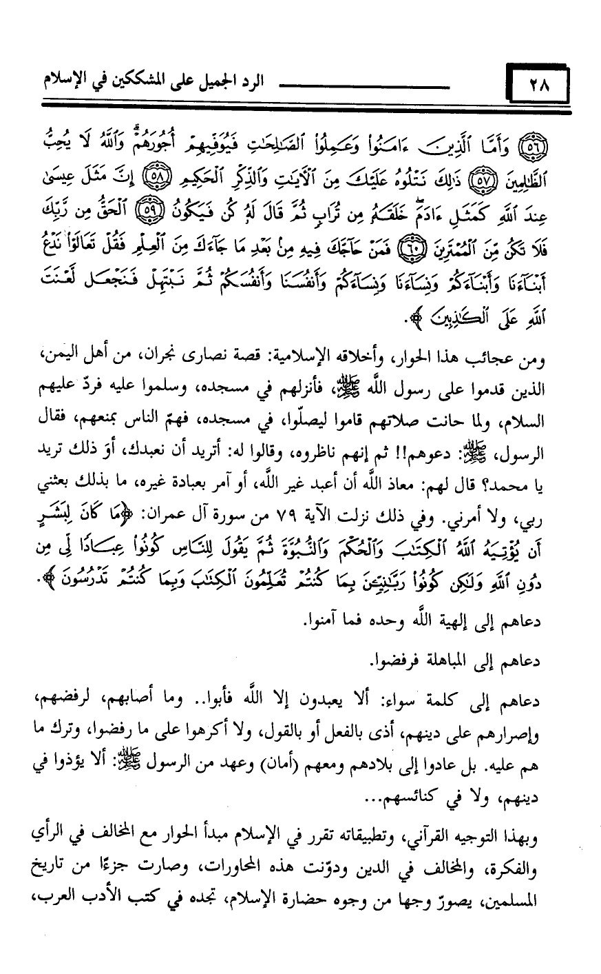 ومن عجائب هذا الحوار، وأخلاقه الإسلامية: قصة نصارى نحران، من أهل اليمن، الذين قدموا على رسول اللَّه - صلى الله عليه وسلم -، فأنزلهم في مسجده، وسلموا عليه فردّ - عليهم السلام، ولما حانت صلاتهم قاموا ليصلّوا، في مسجده، فهمّ الناس بمنعهم، فقال