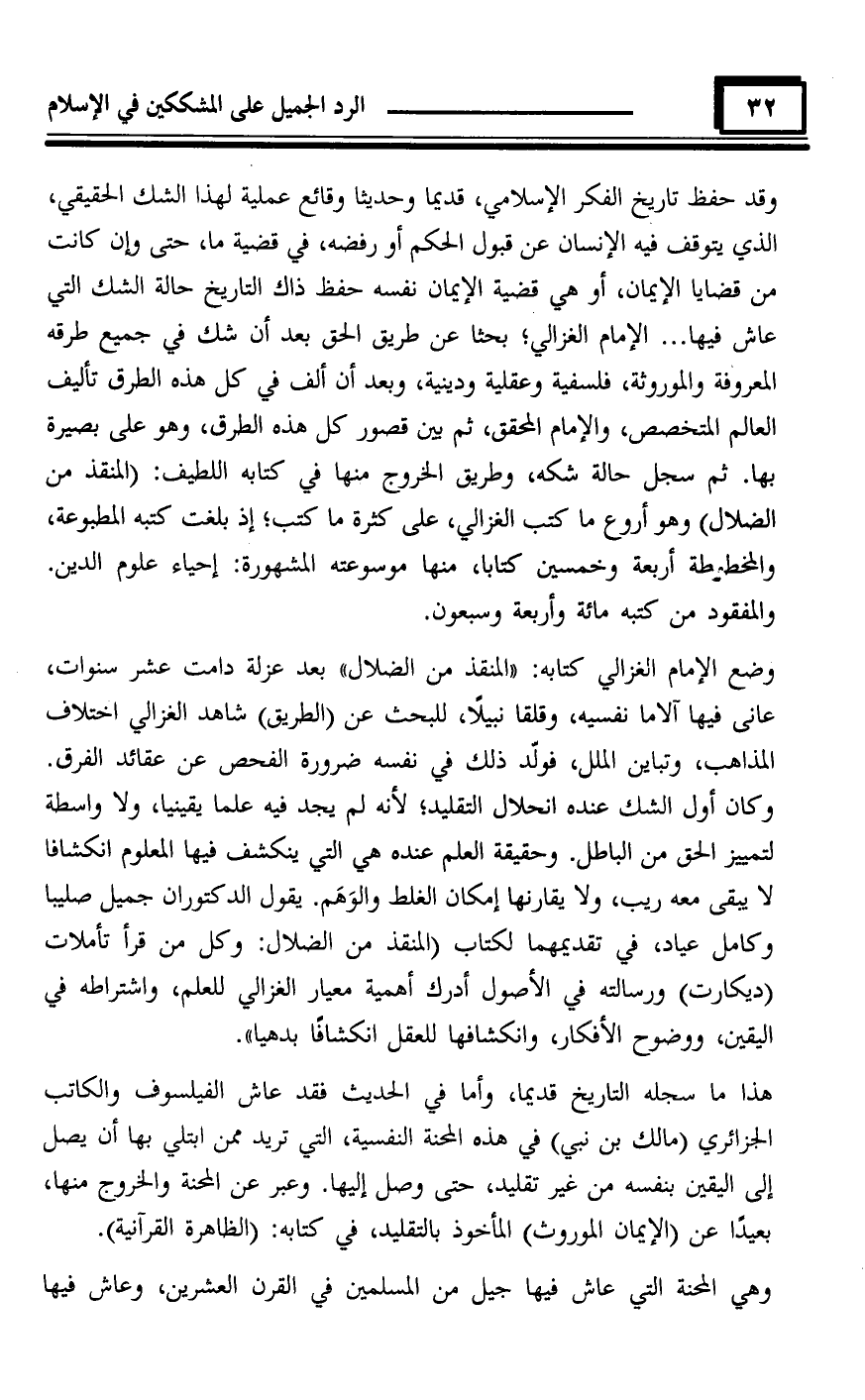 وقد حفظ تاريخ الفكر الإسلامي، قديما وحديثا وقائع عملية لهذا الشك الحقيقي، الذي يتوقف فيه الإنسان عن قبول الحكم أو رفضه، في قضية ما، حتى وإن كانت من قضايا الإيمان، أو هي قضية الإيمان نفسه حفظ ذاك التاريخ حالة الشك التي عاش فيها. . . الإمام الغزالي؛ بحثا عن طريق الحق بعد أن شك في جميع طرقه المعروفة والموروثة، فلسفية وعقلية ودينية، وبعد أن ألف في كل هذه الطرق تأليف العالم المتخصص، والإمام المحقق، ثم لن قصور كل هذه الطرق، وهو على بصيرة بها.