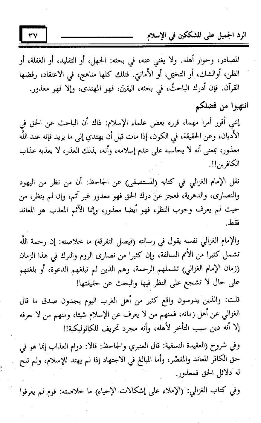 والإمام الغزالي نفسه يقول في رسالته (فيصل التفرقة) ما خلاصته: إن رحمة اللَّه تشمل كثيرا من الأم السالفة، وإن كثيرا من نصارى الروم والترك في هذا الزمان (زمان الإمام الغزالي) تشملهم الرحمة، وهم الذين لم تبلغهم الدعوة، أو بلغتهم على حال لا تشجع على النظر فيها والبحث عن حقيقتها!