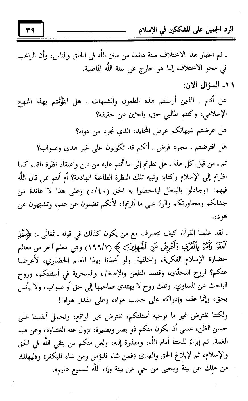 ولو أخذنا بهذا المعلم الحضاري، لأعرضنا عنكم؛ لروح التحدّي، وقصد الطعن والإصغار، والسخرية في أسئلتكم، وروح الباحث عن المساوي.