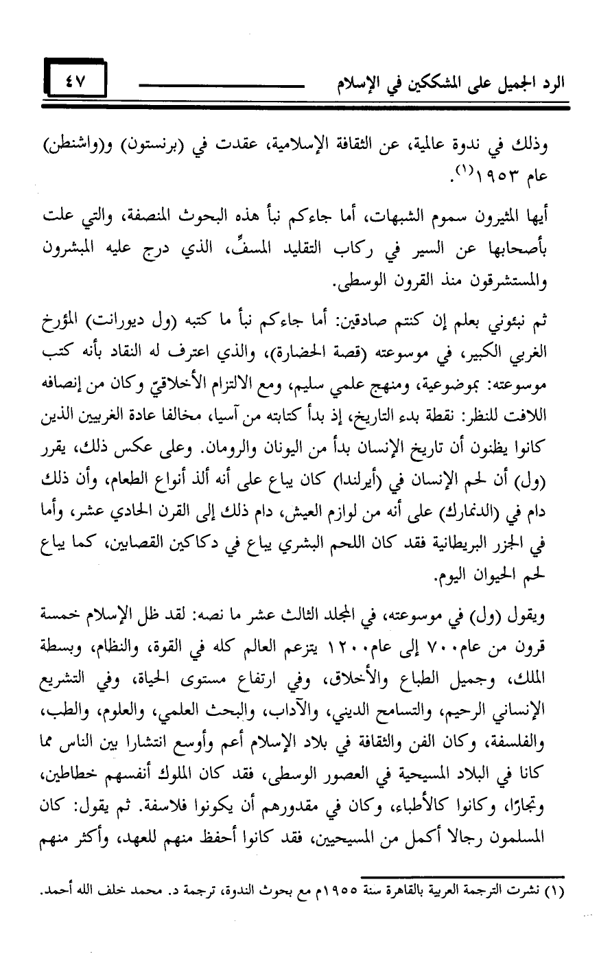 أيها المثيرون سموم الشبهات، أما جاءكم نبأ هذه البحوث المنصفة، والتي علت بأصحابها عن السير في ركاب التقليد المسفِّ، الذي درج عليه المبشرون والمستشرقون منذ القرون الوسطى.