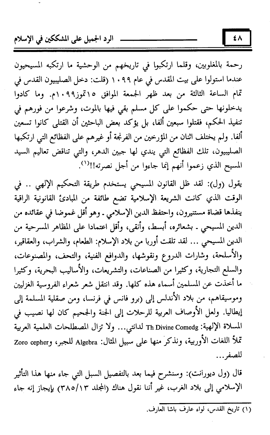 قال (ول ديورانت) : وسنشرح فيما بعد بالتفصيل السبل التي جاء منها هذا التأثير الإسلامي إلى بلاد الغرب، غير أننا نقول هناك (المجلد 13 / 385) بإيجاز إنه جاء