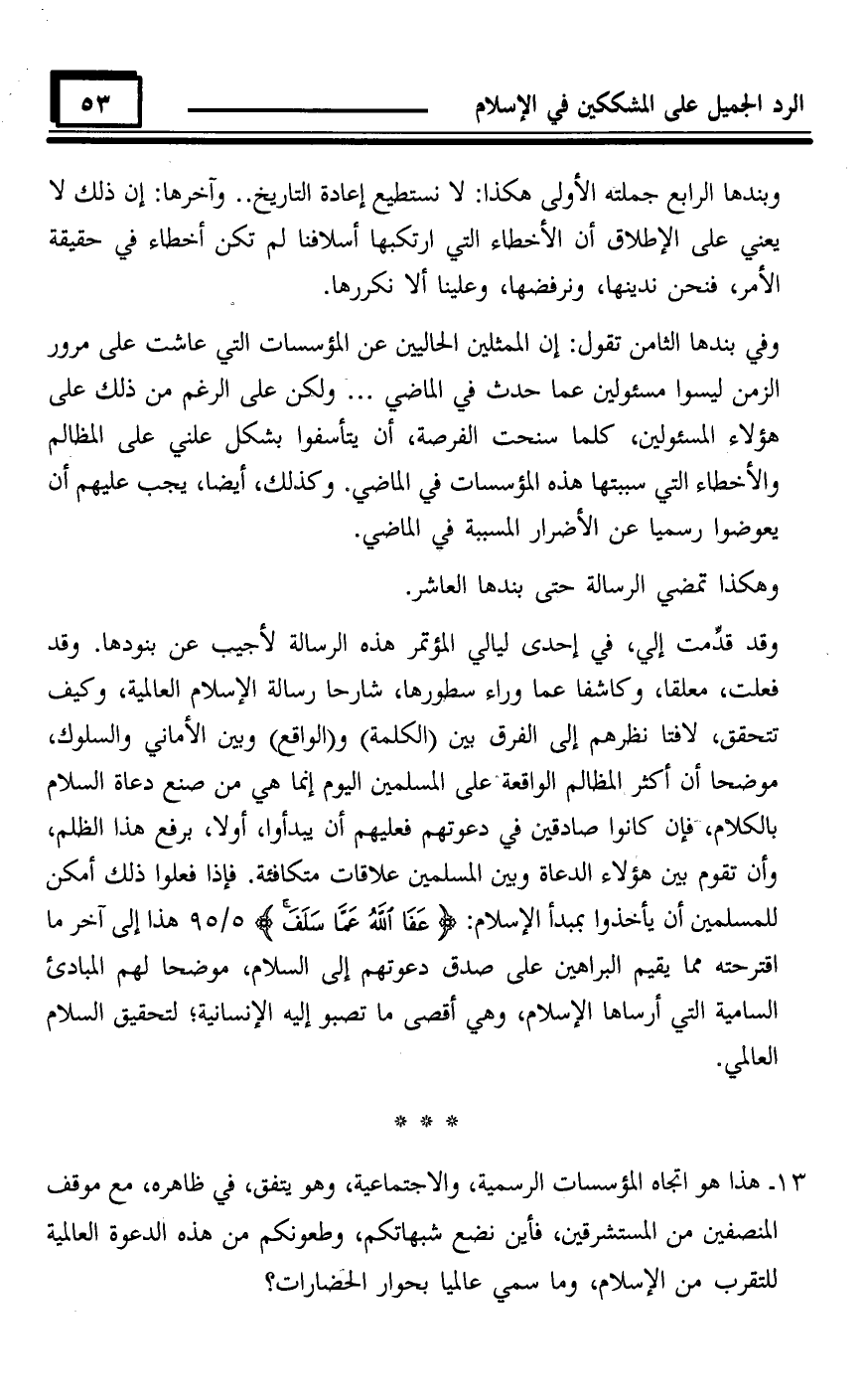 13 - هذا هو اتجاه المؤسسات الرسمية، والاجتماعية، وهو يتفق، في ظاهره، مع موقف المنصفين من المستشرقين، فأين نضع شبهاتكم، وطعونكم من هذه الدعوة العالمية