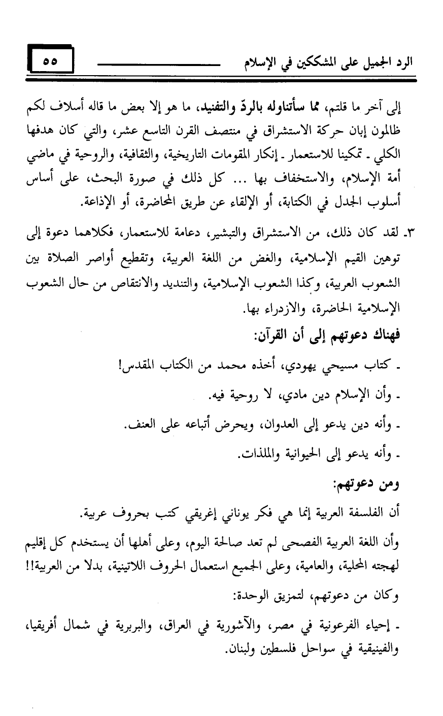إلى آخر ما قدتم، ول سأتناوله بالردّ والتفنيد، ما هو إلا بعض ما قاله أسلاف لكم ظالمون إبان حركة الاستشرق في منتصف القرن التاسع عشر، والتي كان هدفها الكلي - تمكينا للاستعمار - إنكار المقومات التاريخية، والثقافية، والروحية في ماضي أمة الإسلام، والاستخفاف بها. ..
