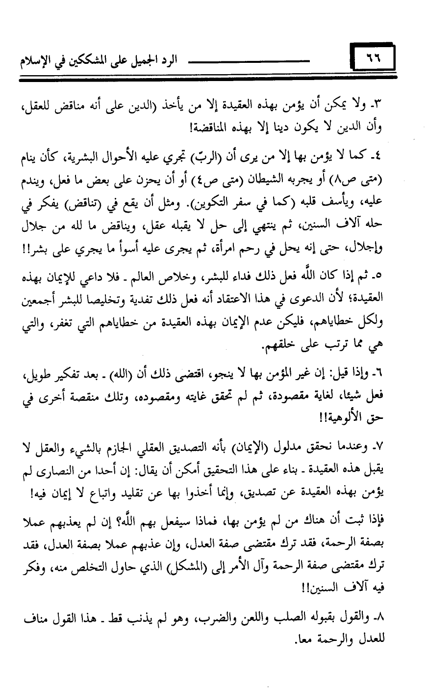 6 - وإذا قيل: إن غير المؤمن بها لا ينجو، اقتضى ذلك أن (الله) - بعد تفكير طويل، فعل شيئا، لغاية مقصودة، ثم لم تحقق غايته ومقصوده، وتلك منقصة أخرى في حق الألوهية!!