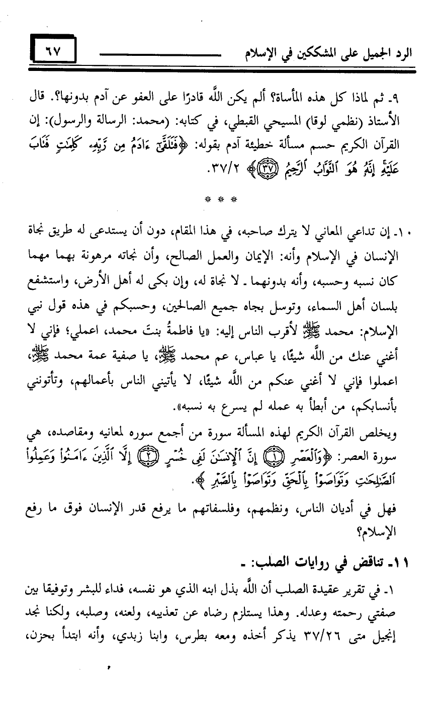 1 - في تقرير عقيدة الصلب أن اللَّه بذل ابنه الذي هو نفسه، فداء للبشر وتوفيقا بين صفتي رحمته وعدله.