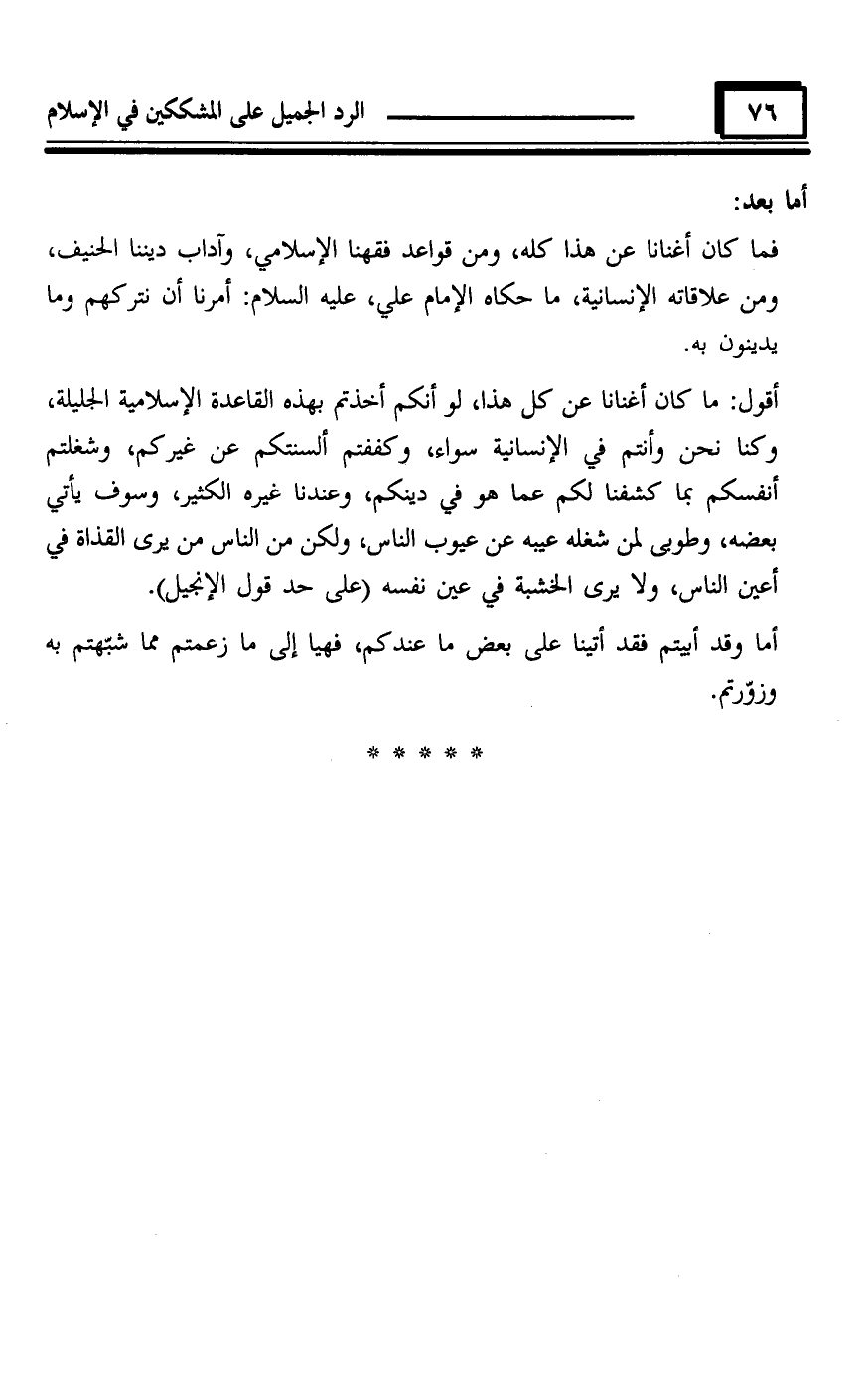 أقول: ما كان أغنانا عن كل هذا، لو أنكم أخذتم بهذه القاعدة الإسلامية الجليلة، وكنا نحن وأنتم في الإنسانية سواء، وكففتم ألسنتكم عن غيركم، وشغلتم أنفسكم بما كشفنا لكم عما هو في دينكم، وعندنا غيره الكثير، وسوف يأتي بعضه، وطوبى لمن شغله عيبه عن عيوب الناس، ولكن من الناس من يرى القذاة في أعين الناس، ولا يرى الخشبة في عين نفسه