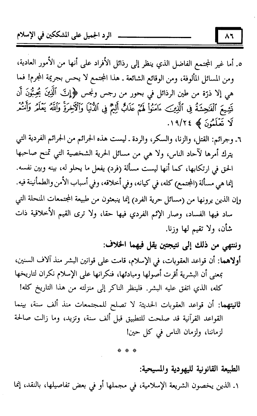 ثانيتهما: أن قواعد العقوبات الحديث! لا تصلح للمجتمعات منذ ألف سنة، بينما القواعد القرآنية قد صلحت للتطبيق قبل ألف سنة، وتزيد، وما زالت صالحة لزماننا، ولزمان الناس في كل حين!