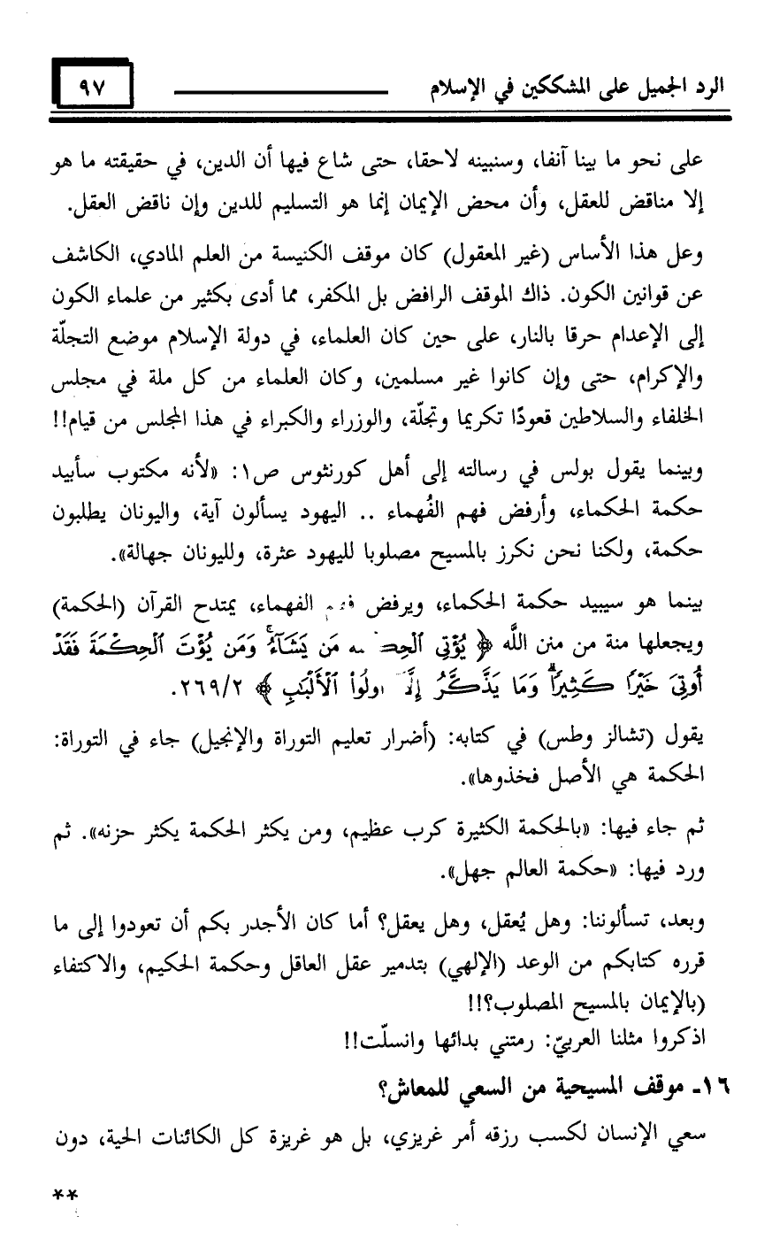 أما كان الأجدر بكم أن تعودوا إِلى ما قرره كتابكم من الوعد (الإلهي) بتدمير عقل العاقل وحكمة الحكيم، والاكتفاء (بالإيمان بالمسيح المصلوب) ؟!!