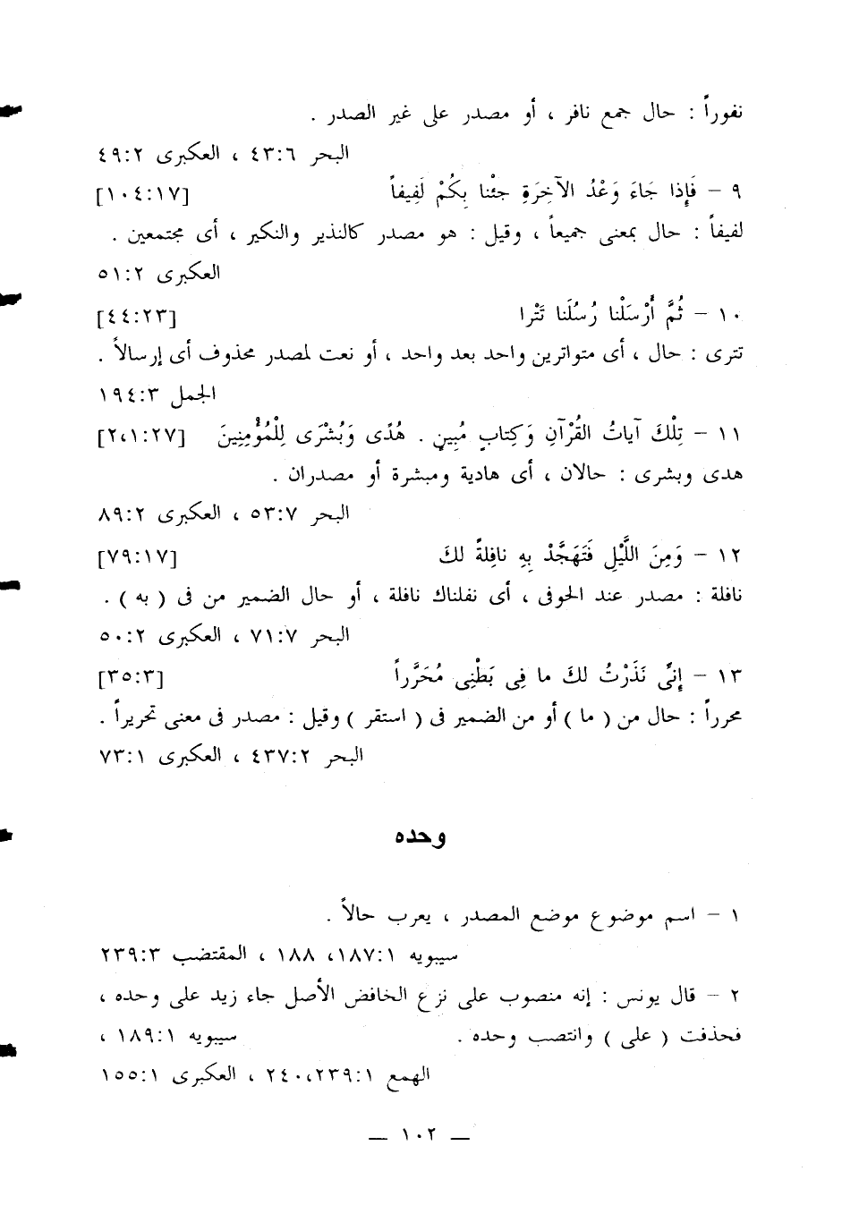 2 - قال يونس: إنه منصوب علي نزع الخافض الأصل جاء زيد علي وحده، فحذقت (علي) وانتصب وحده. سيبويه 189:1، الهمع 239:1، 240، العكبري 155:1