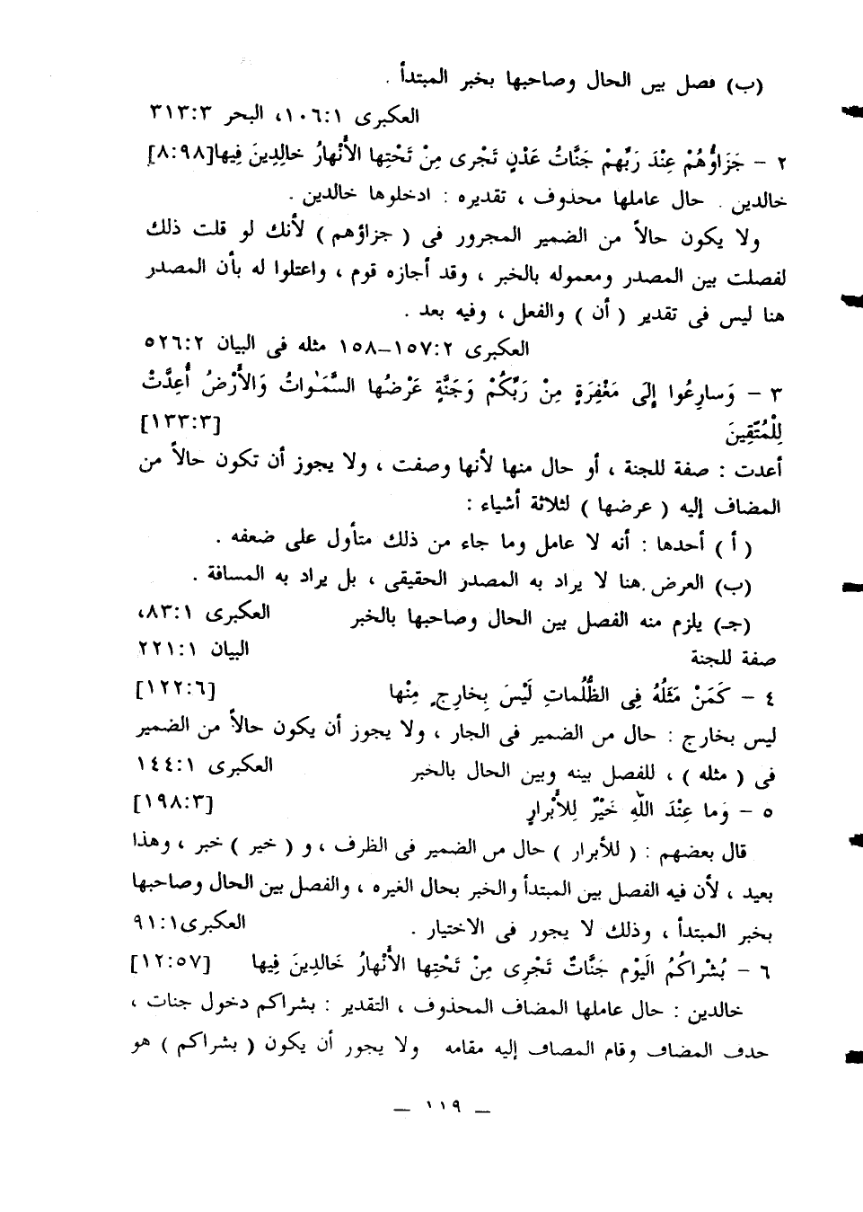 (جـ) يلزم منه الفصل بين الحال وصاحبها بالخبر صفة للجنة العكبري 83:1، البيان 221:1