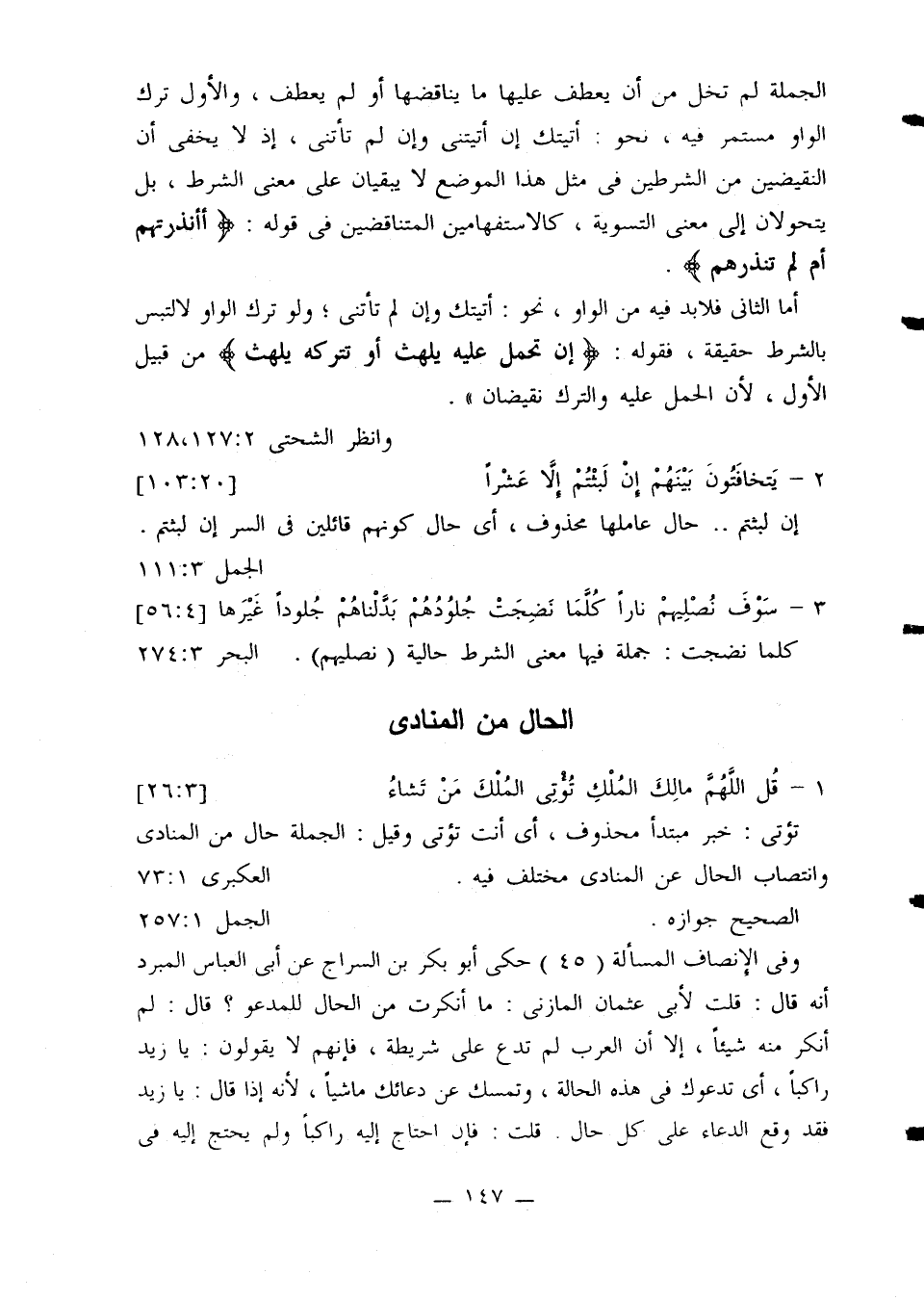 وفي الإنصاف المسالة (45) حكى أبو بكر بن السراج عن أبي العباس المبرد أنه قال: قلت لأبي عثمان المازني: ما أنكرت من الحال للمدعو؟ قال: لم أنكر منه شيئًا، إلا أن العرب لم تدع على شريطة، فإنهم لا يقولون: يا زيد راكبًا، أي تدعوك في هذه الحالة، وتمسك عن دعائك ماشيًا، لأنه إذا قال: يا زيد فقد وقع الدعاء على كل حال. قلت: فإن احتاج إليه راكبًا ولم يحتج إليه في