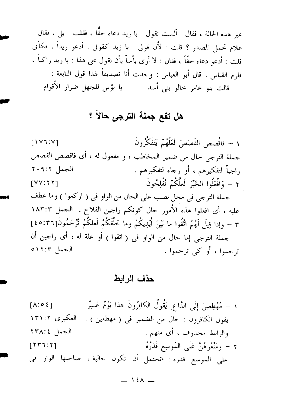 جملة الترجي حال من ضمير المخاطب، ومفعول له، أي فاقصص القصص راجيًا لتفكيرهم، أو رجاء لتفكيرهم. الجمل 209:2