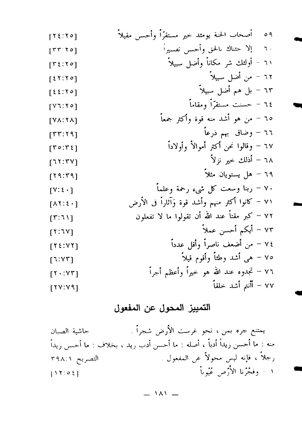 يمتنع جره بمن، نحو غرست الأرض شجراً. حاشية الصبان منه: ما أحسن زيداً أدباً، أصله: ما أحسن أدب زيد، بخلاف: ما أحسن زيداً رجلاً، فإنه ليس محولاً عن المفعول. التصريح 398:1