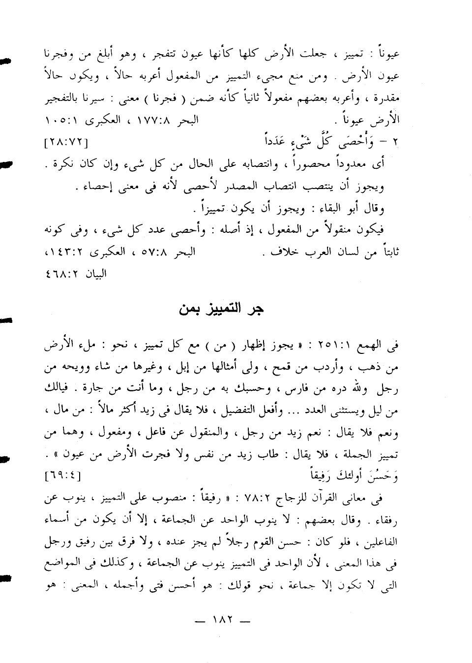 في الهمع 251:1: «يجوز إظهار (من) مع كل تمييز، نحو: ملء الأرض من ذهب، وأردب من قمح، ولى أمثالها من إبل، وغيرها من شاء وويحه من رجل ولله دره من فارس، وحسبك به من رجل، وما أنت من جارة. فيا لك من ليل ويستثنى العدد ... وأفعل التفضيل، فلا يقال في زيد أكثر مالاً: من مال، ونعم فلا يقال: نعم زيد من رجل، والمنقول عن فاعل، ومفعول، وهما من تمييز الجملة، فلا يقال: طاب زيد من نفس ولا فجرت الأرض من عيون».