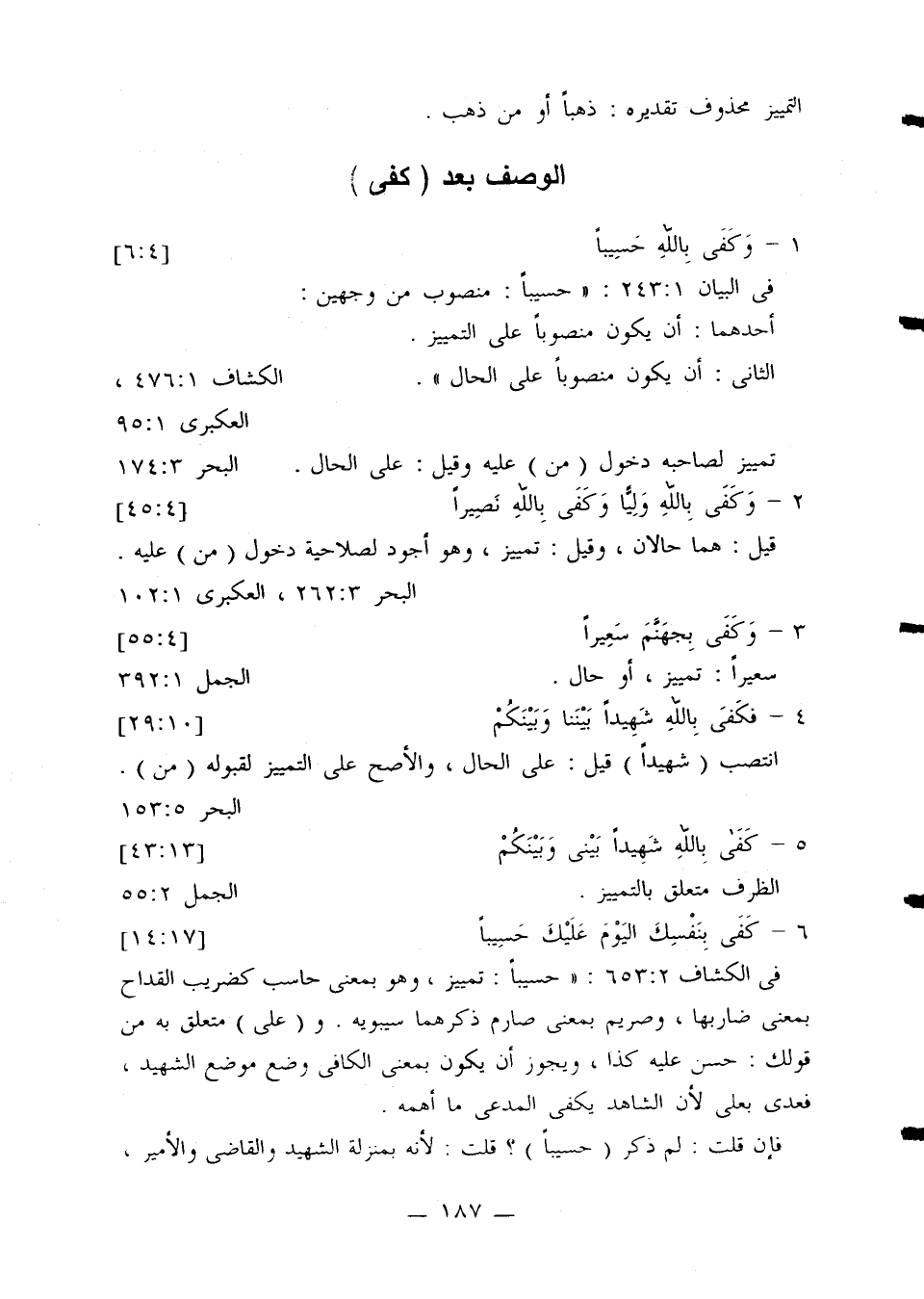 في الكشاف 653:2: «حسيبًا: تمييز، وهو بمعنى حاسب كضريب القداح بمعنى ضاربها، وصريم بمعنى صارم ذكرهما سيبويه. و (على) متعلق به من قولك: حسن عليه كذا، ويجوز أن يكون بمعنى الكافي وضع موضع الشهيد، فعدى بعلى لأن الشاهد بكفى المدعى ما أهمه.