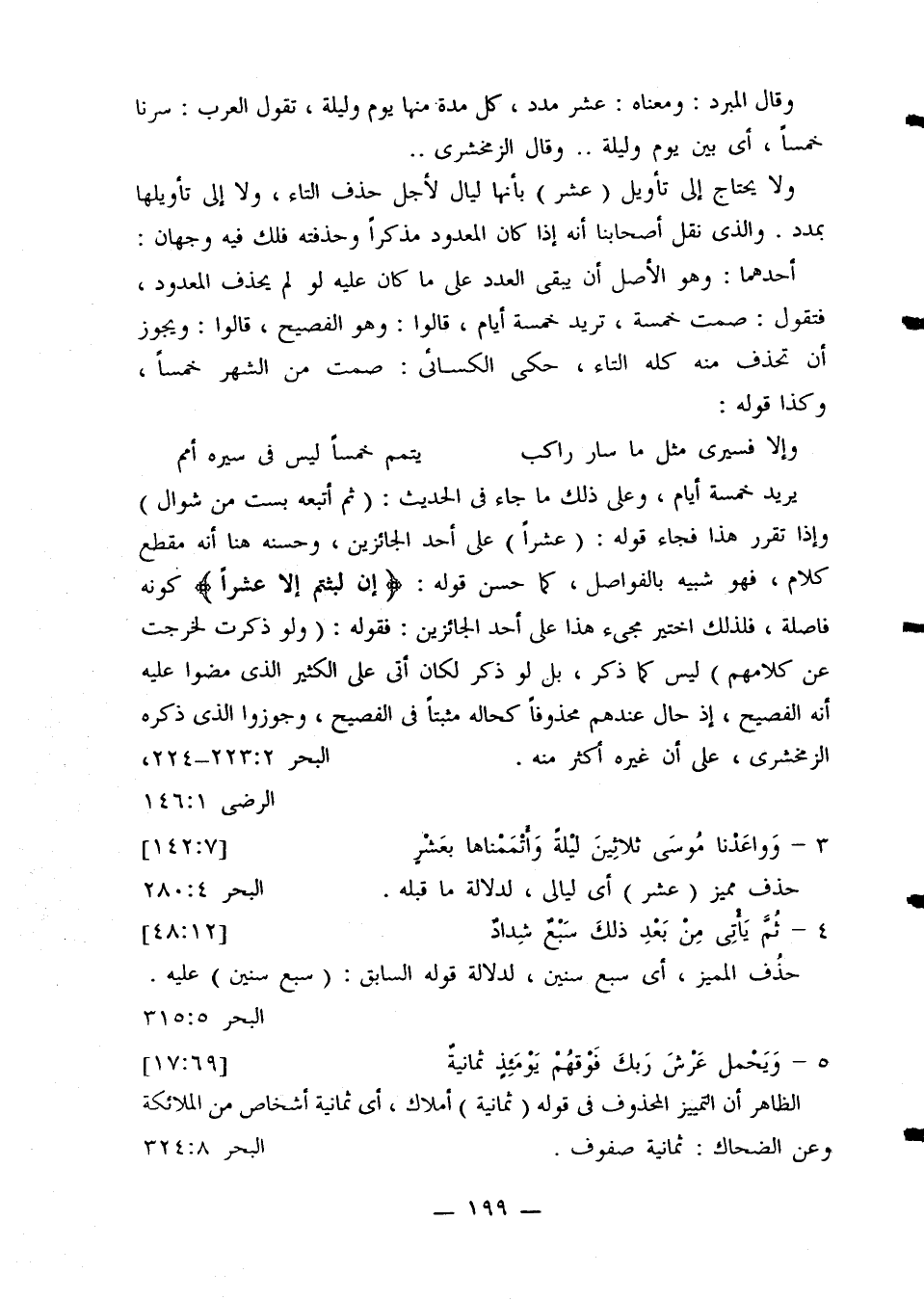 يريد خمسة أيام، وعلى ذلك ما جاء في الحديث: (ثم أتبعه بست من شوال) وإذا تقرر هذا فجاء قوله: (عشرًا) على أحد الجائزين، وحسنه هنا أنه مقطع كلام، فهو شبيه بالفواصل، كما حسن قوله: {إن لبثتم إلا عشر} كونه فاصلة، فلذلك اختير مجيء هذا على أحد الجائزين: فقوله: (ولو ذكرت لخرجت عن كلامهم) ليس كما ذكر، بل لو ذكر لكان أتى على الكثير الذي مضوا عليه أنه الفصيح، إذ حال عندهم محذوفًا كحاله مثبتًا في الفصيح، وجوزوا الذي ذكره الزمخشري، على أن غيره أكثر منه. البحر 223:2 - 224، الرضي 146:1