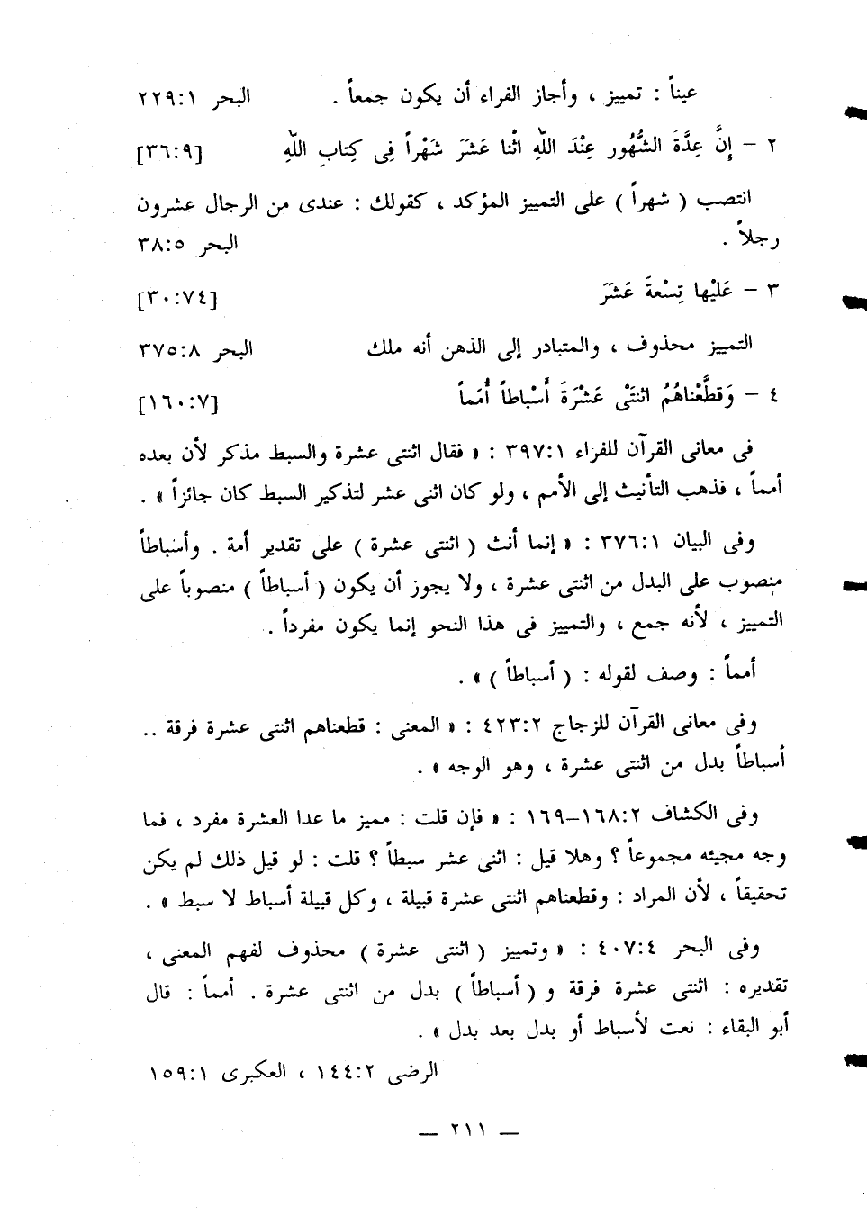وفي الكشاف 168:2 - 169: «فإن قلت: مميز ما عدا العشرة مفردة، فما وجه مجيئه مجموعاً؟ وهلا قيل: اثني عشر سبطاً؟ قلت: لو قيل ذلك لم يكن تحقيقاً، لأن المراد: وقطعناهم اثنتي عشرة قبيلة، وكل قبيلة أسباط لا سبط».
