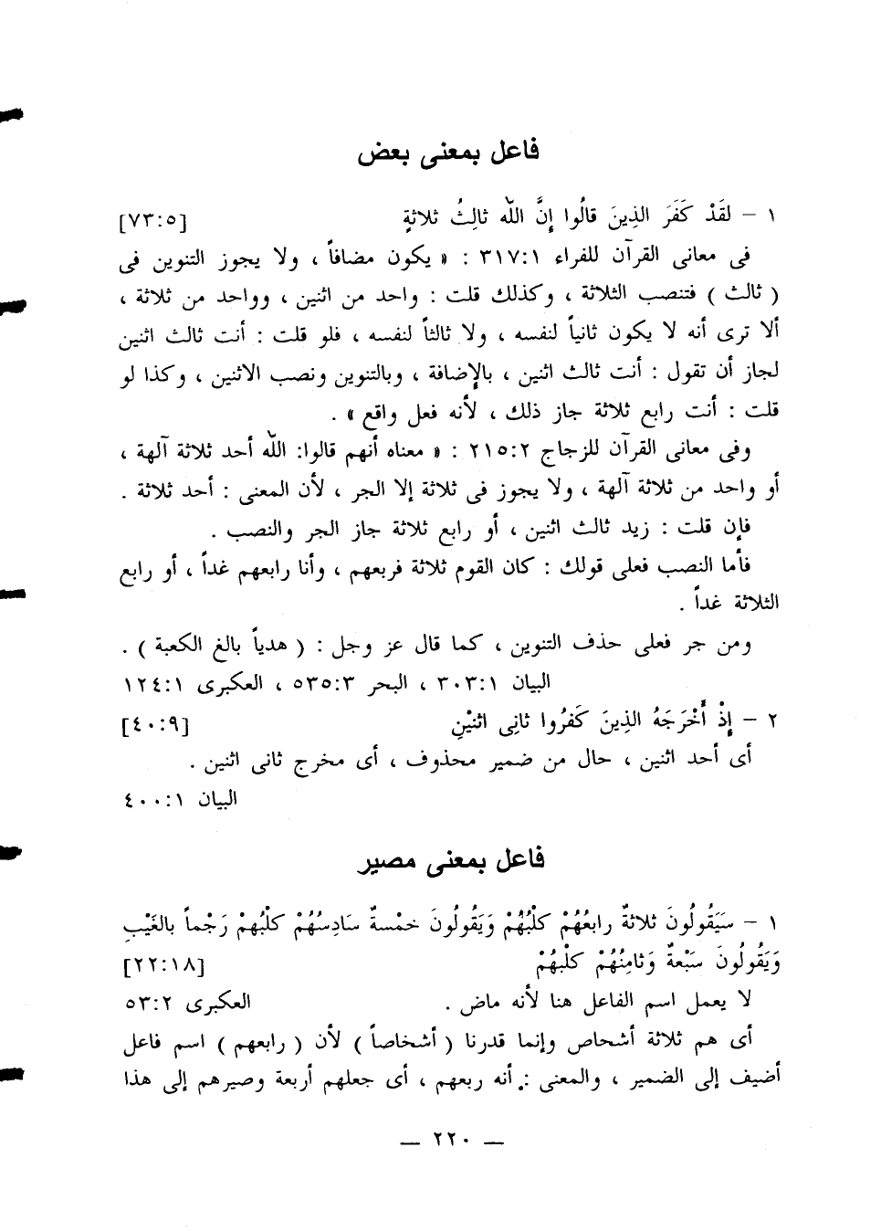 في معاني القرآن للفراء 317:1: «يكون مضافًا، ولا يجوز التنوين في (ثالث) فتنصب الثلاثة، وكذلك قلت: واحد من اثنين، وواحد من ثلاثة، ألا ترى أنه لا يكون ثانيًا لنفسه، ولا ثالثًا لنفسه، فلو قلت: أنت ثالث اثنين لجاز أن تقول: أنت ثالث اثنين، بالإضافة، وبالتنوين ونصب الاثنين، وكذا لو قلت: أنت رابع ثلاثة جاز ذلك، لأنه فعل واقع».