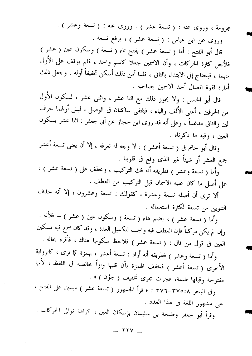 وأما (تسعة عشر)، بضم هاء (تسعة) وسكون عين (عشر) -فلأنه- وإن لم يكن مركبا فإن العطف فيه واجب لتكميل العدة، وقد كان سمع فيه تسكين العين في قول من قال: (تسعة عشر) فلاحظ سكونها هناك، فأقره بحاله. وأما (تسعة وعشر) فطريقه أنه أراد: تسعة أعشر، بهمزة كما تري، كالرواية الأخرى (تسعة أعشر) فخفف الهمزة بأن قلبها واوا خالصة في اللفظ، لأنها مفتوحة وقبلها ضمة، فجرت مجري تخفيف (جؤن)».